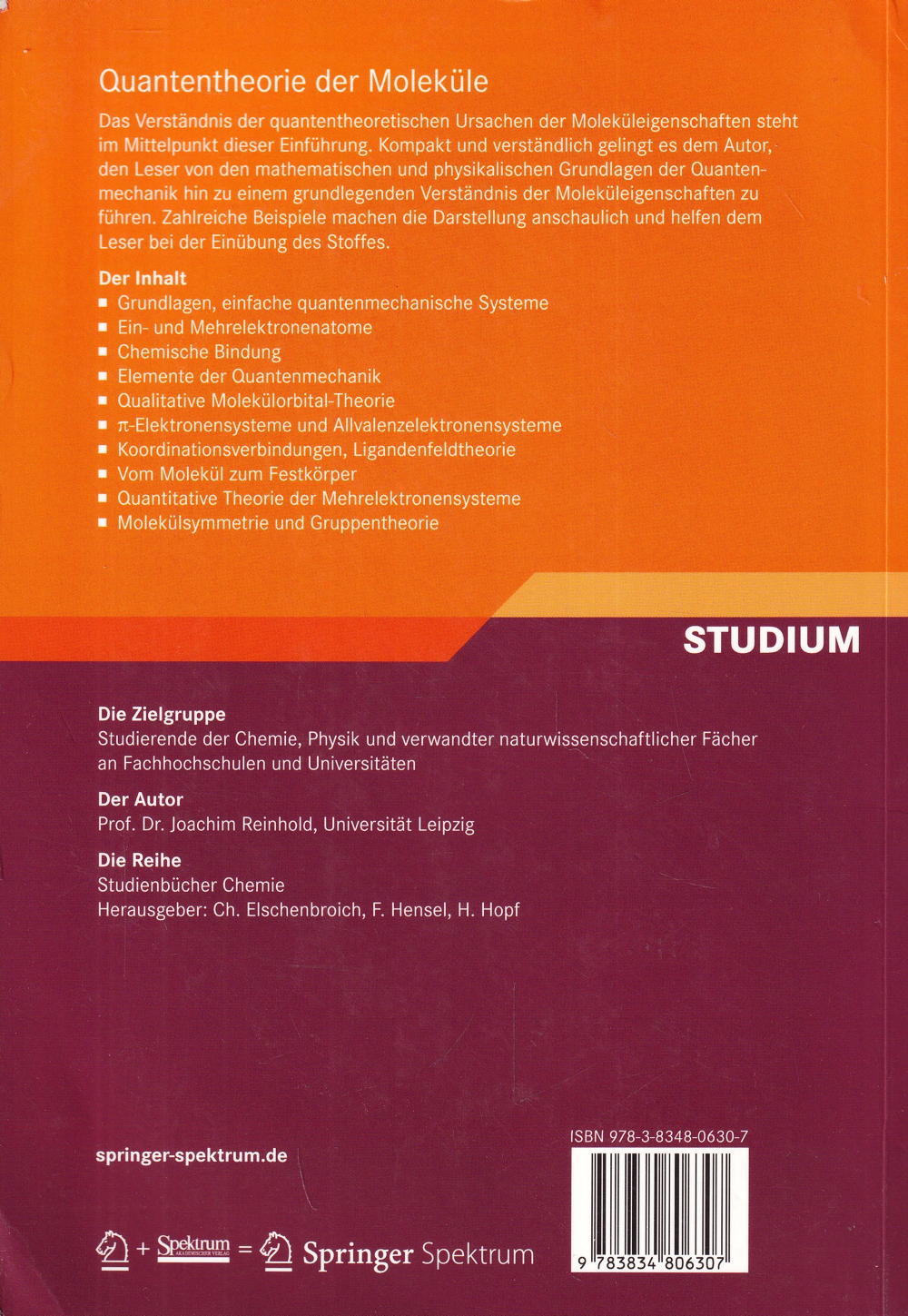 Das Verständnis der quantentheoretischen Ursachen der Moleküleigenschaften steht im Mittelpunkt dieser Einführung. Kompakt und verständlich gelingt es dem Autor, den Leser von den mathematischen und physikalischen Grundlagen der Quantenmechanik hin zu einem grundlegenden Verständnis der Moleküleigenschaften zu führen. Zahlreiche Beispiele machen die Darstellung anschaulich und helfen dem Leser bei der Einübung des Stoffes. Der InhaltGrundlagen, einfache quantenmechanische Systeme - Ein- und Mehrelektronenatome - Chemische Bindung - Elemente der Quantenmechanik - Qualitative Molekülorbital-Theorie - π-Elektronensysteme und Allvalenzelektronensysteme - Koordinationsverbindungen, Ligandenfeldtheorie - Vom Molekül zum Festkörper - Quantitative Theorie der Mehrelektronensysteme - Molekülsymmetrie und Gruppentheorie