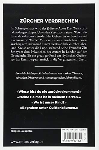 Ein vielschichtiger Kriminalroman rund um die Folgen von Flucht und Terror. Im Zürcher Schauspielhaus wird der jüdische Autor Dan Weisz brutal niedergeschlagen. Die Ermittlungen weiten sich aus: Commissario Werner Meier nimmt rechtsradikale Oberland-Kreise unter die Lupe, während seine Freundin Zita Schnyder dem Privatleben des bekannten Autors in London auf den Grund geht. Bis ein grausiger Fund am idyllischen Greifensee das Ermittlerpaar zurück in die 80er Jahre führt.
