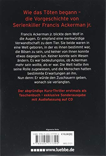 Francis Ackerman jr. blickte dem Wolf in die Augen. Er empfand eine merkwürdige Verwandtschaft zu dem Tier. Sie beide waren in eine Welt geboren, in der es ihnen bestimmt war, die Bösen zu sein, und keiner von ihnen konnte etwas dagegen tun. Keiner konnte sein Wesen ändern. Es war bedeutungslos, ob Ackerman mehr sein wollte, als er war. Die Welt hatte ihm seine Rolle zugewiesen, und die Menschen hatten bestimmte Erwartungen an ihn. Nun denn: Er würde den Zuschauern geben, wonach sie verlangten.
