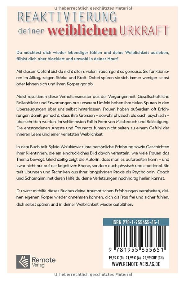 Mit diesem Gefühl bist du nicht allein, vielen Frauen geht es genauso. Sie funktionieren im Alltag, zeigen Stärke und Kraft. Dabei spüren sie sich immer weniger selbst oder lehnen sich und ihren Körper gar ab. Meist resultieren diese Verhaltensmuster aus der Vergangenheit. Gesellschaftliche Rollenbilder und Erwartungen aus unserem Umfeld haben ihre tiefen Spuren in den Überzeugungen über uns selbst hinterlassen, was sich wiederum auf unser Selbstwert und unser Selbstbewusstsein stark auswirkt. Frauen haben ausserdem oft Erfahrungen damit gemacht, dass ihre Grenzen – sowohl physisch als auch psychisch – überschritten wurden. Im schlimmsten Fall in Form von Missbrauch und Belästigung oder gar einer Vergewaltigung. Die entstandene Angst und das Trauma führen nicht selten zu einem Gefühl der inneren Leere und einer verletzten Weiblichkeit. In dem Buch teilt Sylvia Walukiewicz ihre persönliche Erfahrung sowie Geschichten ihrer Klientinnen, die ein eindrückliches Bild davon vermitteln, wie viele Frauen das Thema bewegt. Gleichzeitig zeigt die Autorin, dass man dies aufarbeiten kann – und zwar nicht nur auf der kognitiven Ebene, sondern auch physisch und emotional. Sie teilt Übungen und Techniken aus ihrer langjährigen Praxis als Psychologin, Coach und Schamanin, mit deren Hilfe du deine Verletzungen nachhaltig heilen kannst und deine Angststörung überwindest. Du wirst mithilfe dieses Buches: deine traumatischen Erfahrungen verarbeiten. deinen eigenen Körper wieder annehmen können. dich als Frau befreit und sicher fühlen. in deiner Weiblichkeit wieder aufblühen. Reaktiviere deine weibliche Urkraft und spüre dich wieder selbst!
