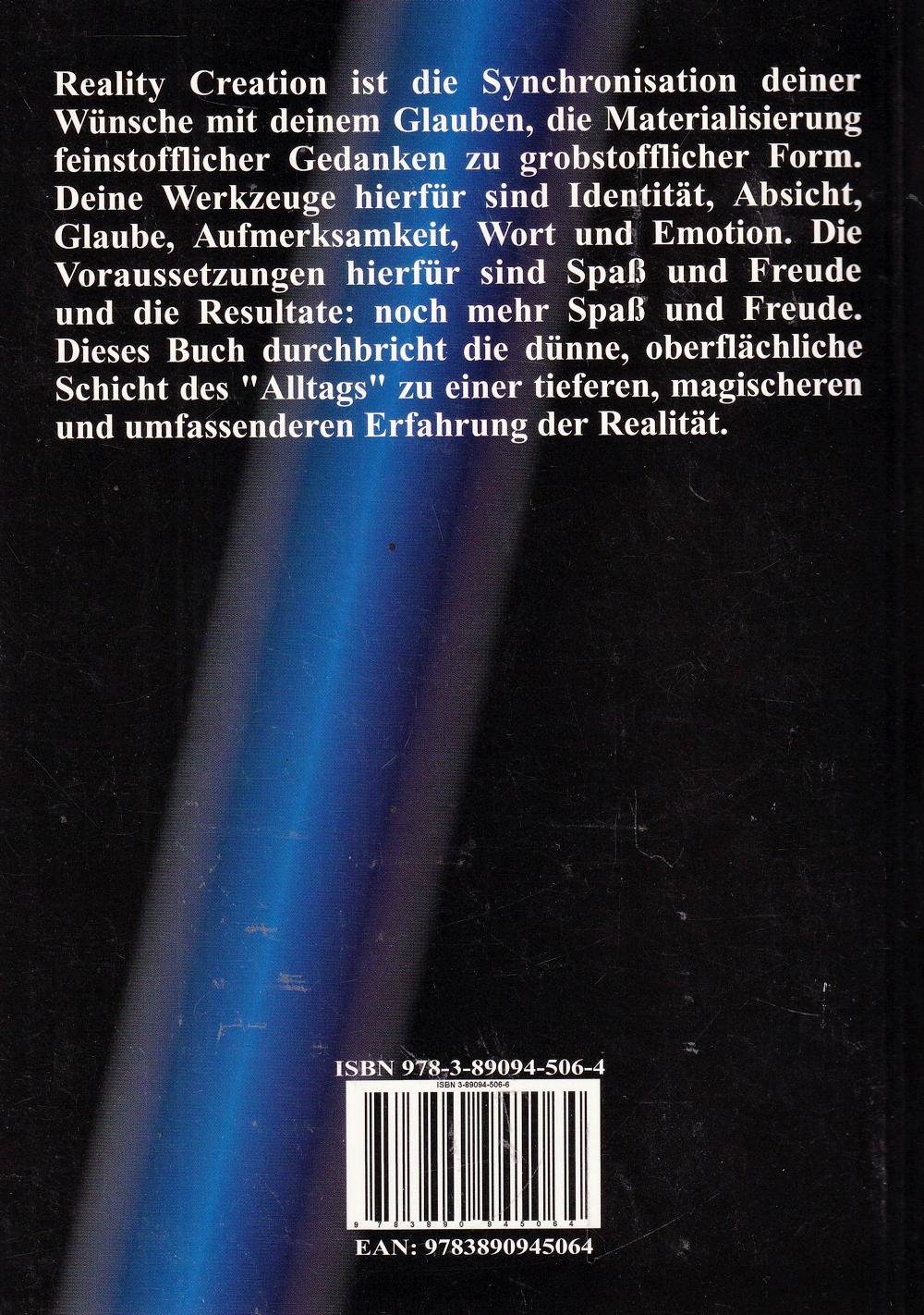 Reality Creation ist die Synchronisation deiner Wünsche mit deinem Glauben, die Materialisierung feinstofflicher Gedanken zu grobstofflicher Form. Deine Werkzeuge hierfür sind Identität, Absicht, Glaube, Aufmerksamkeit, Wort und Emotion. Die Vorraussetzungen hierfür sind Spass und Freude und die Resultate noch mehr Spass und Freude. Dieses Buch durchbricht die dünne, oberflächliche Schicht des"Alltags"zu einer tieferen, magischeren und umfassenderen Erfahrung der Realität.