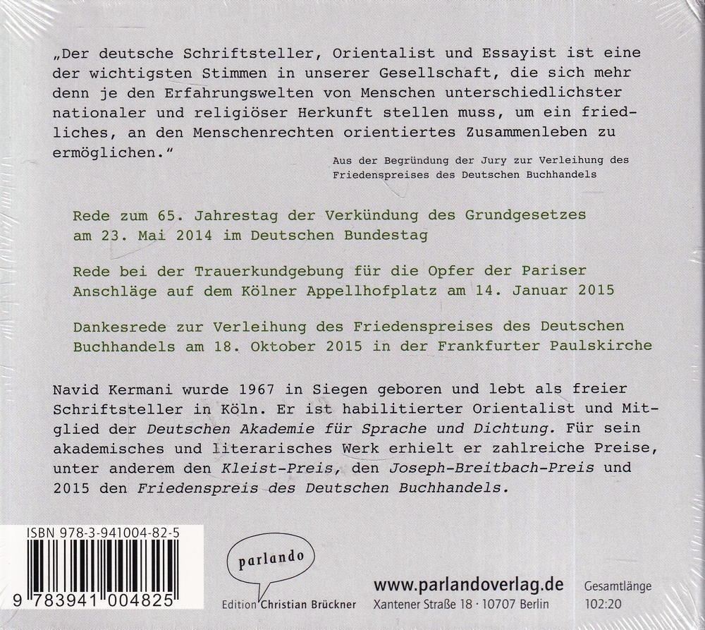 Das Hörbuch beinhaltet drei zentrale Reden, die Navid Kermani in den letzten zwei Jahren zu offiziellen Ereignissen gehalten hat:
