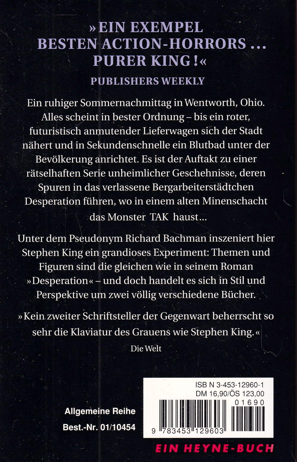 An einem ruhigen Sommernachmittag tauchen in einem verschlafenen Städtchen futuritisch anmutende Lieferwagen auf. Ohne jede Vorwarnung richten sie ein furchtbares Blutbad an. Panik macht sich breit, doch bald müssen die Überlebenden feststellen, dass dies nur der Auftakt zu einem schrecklichen Alptraum war. Ein Horrorroman, von Stephen King unter seinem alten Pseudonym verfasst.