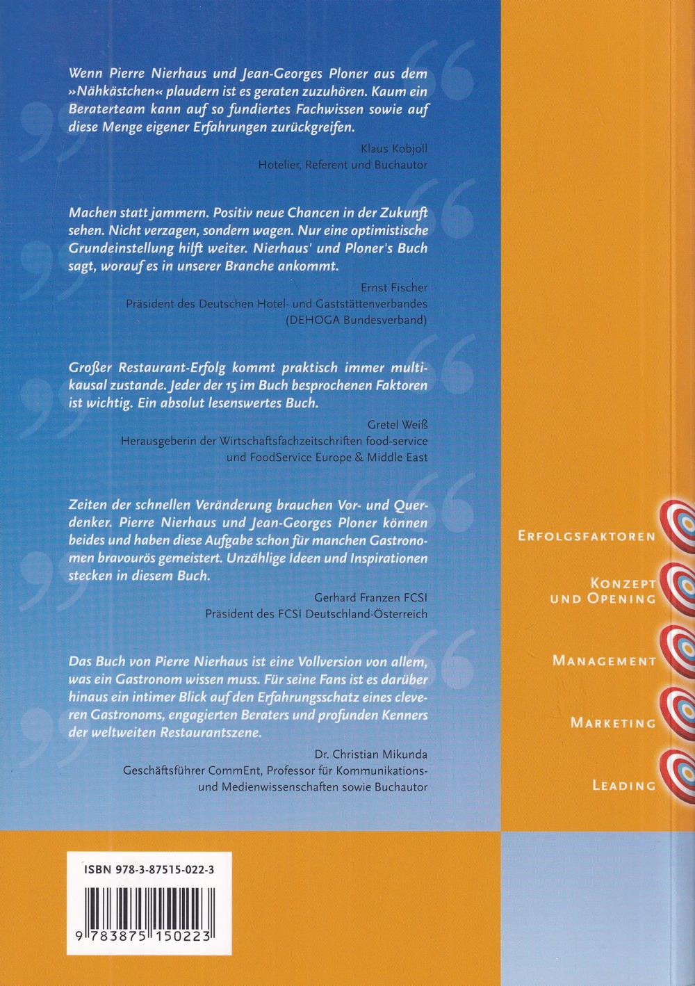 Entscheidend für den Erfolg in der Gastronomie ist das richtige Konzept zur richtigen Zeit für den entsprechenden Bedarf. Dabei spielen die Menschen die wichtigste Rolle – Mitarbeiter und Gäste. Eine grundsätzlich starke Marketing-und Sales-Orientierung, ein klares Bekenntnis des Betriebs zur eigenen Marke und die Einbeziehung neuer Trends in Management und Marketing sind wichtige Erfolgsfaktoren. Es sind die Softfacts, die so häufig unterschätzt werden, auf die der Erfolg basiert. Pierre Nierhaus und Jean-Georges Ploner, zwei anerkannte Fachmänner der Branche, wissen wovon sie reden: in Ihrer täglichen Praxis coachen, beraten und führen Sie Gastronomiebetriebe. Die unterschiedlichen Spezialgebiete machen Sie zum „Dreamteam“. Dieses Buch ist ein Muss für jeden, der Innovation und Strategien sucht, um die Chancen der Zukunft für sich und sein Unternehmen zu nutzen.