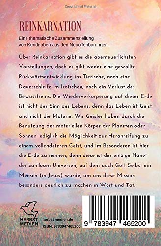 Über Reinkarnation gibt es die abenteuerlichsten Vorstellungen, doch es gibt weder eine Rückwärtsentwicklung ins Tierische, noch eine Dauerschleife im Irdischen, noch ein Verlust des Bewusstseins. Die Wiederverkörperung auf dieser Erde ist nicht der Sinn des Lebens, denn das Leben ist Geist und nicht die Materie.
