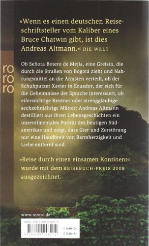 „Wenn es einen deutschen Reiseschriftsteller vom Kaliber eines Bruce Chatwin gibt, ist dies Andreas Altmann“ (Die Welt) Ob Señora Botero de Mejía, eine Greisin, die durch die Strassen von Bogota zieht und Nahrungsmittel an die Ärmsten verteilt, ob der Schuhputer Xavier in Ecuador, der sich für die Geheimnisse der Sprache interessiert, ob eifersüchtige Rentner oder strenggläubige 16-jährige Mütter: Andreas Altmann destilliert aus ihren Lebensgeschichten ein unsentimentales Porträt des heutigen Südamerika und zeigt, dass Gier und Zerstörung nur eine Handbreit von Barmherzigkeit und Liebe entfernt sind. „Reise durch einen einsamen Kontinent“ wurde mit dem REISEBUCH-PREIS 2008ausgezeichnet.