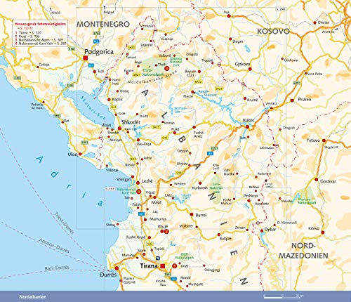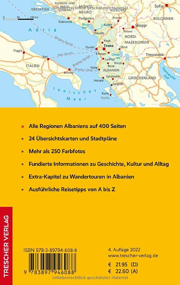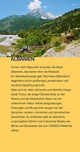 Immer mehr Reisende entdecken die Reize Albaniens, das bisher eher als Ziel für Abenteuerlustige galt. Das kleine Balkanland begeistert durch grossartige Landschaften und herzliche Gastfreundschaft. Der Trescher-Reiseführer ALBANIEN beschreibt sämtliche Sehenswürdigkeiten und bietet neben ausführlichen Hintergrundinformationen zu Land und Leuten viele praktische Tipps und Hinweise zur Reisevorbereitung. Ein zusätzliches Kapitel stellt die vielfältigen Wandermöglichkeiten in Albanien vor. Beliebte Reiseziele in Albanien sind vor allem die bunte und lebhafte Hauptstadt Tirana, die langen Sandstrände an der Riviera und die Albanischen Alpen mit viel unberührter Natur. Ausgrabungsstätten wie Apollonia und Butrint, Festungen und Burgruinen zeugen von der illyrischen, antiken, römischen und osmanischen Geschichte. Zu entdecken gibt es zahlreiche ursprüngliche Dörfer und malerische Städte wie Berat und Gjirokastër, die zum UNESCO-Welterbe zählen. >>> Weitere Reiseführer zum westlichen Balkan finden Sie auf der Website des Trescher Verlags.