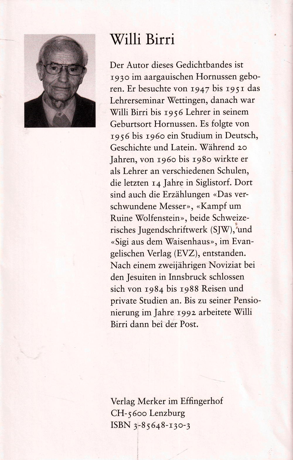 Willi Birri Der Autor dieses Gedichtbandes ist 1930 im aargauischen Hornussen geboren. Er besuchte von 1947 bis 1951 das Lehrerseminar Wettingen, danach war Willi Birri bis 1956 Lehrer in seinem Geburtsort Hornussen. Es folgte von 1956 bis 1960 ein Studium in Deutsch, Geschichte und Latein. Während 20 Jahren, von 1960 bis 1980 wirkte er als Lehrer an verschiedenen Schulen, die letzten 14 Jahre in Siglistorf. Dort sind auch die Erzählungen «Das verschwundene Messer», «Kampf um Ruine Wolfenstein», beide Schweizerisches Jugendschriftwerk (SJW), 'und «Sigi aus dem Waisenhaus», im Evangelischen Verlag (EVZ), entstanden.