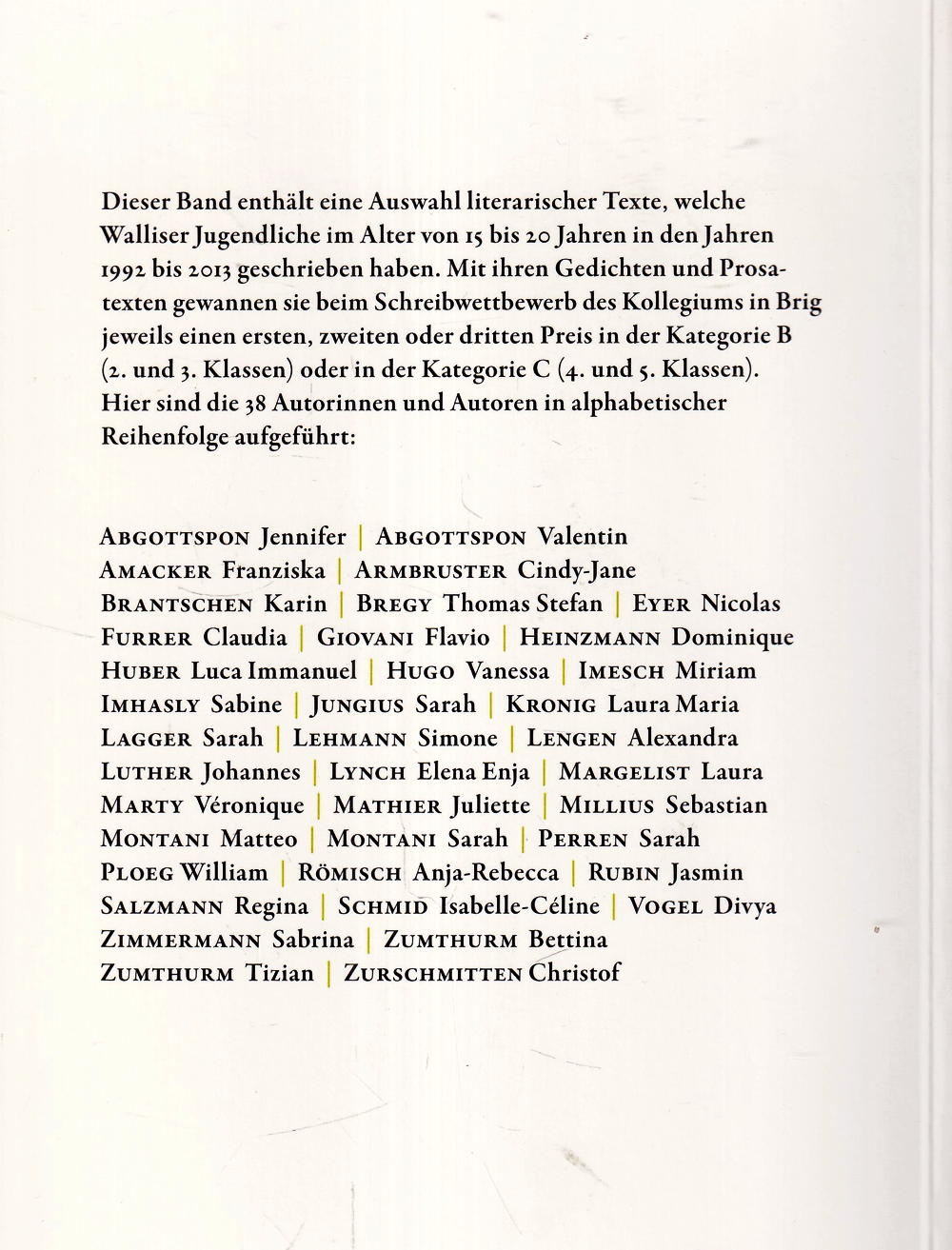 Dieser Band enthält eine Auswahl literarischer Texte, welche Walliser Jugendliche im Alter von 15 bis 20 Jahren in den Jahren 1992 bis 2013 geschrieben haben. Mit ihren Gedichten und Prosatexten gewannen sie beim Schreibwettbewerb des Kollegiums in Brig jeweils einen ersten, zweiten oder dritten Preis in der Kategorie B (2. Und 3. Klassen) oder in der Kategorie C (4. Und 5. Klassen).
