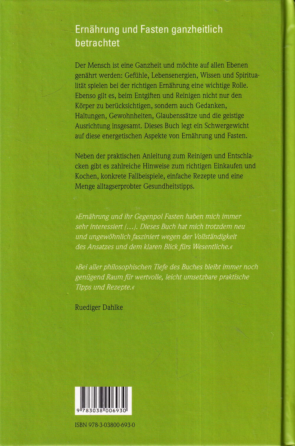 Ernährung und Fasten ganzheitlich betrachtet. Der Mensch ist eine Ganzheit und möchte auf allen Ebenen genährt werden: Gefühle, Lebensenergien, Wissen und Spiritualität spielen bei der richtigen Ernährung eine wichtige Rolle. Ebenso gilt es, beim Entgiften und Reinigen nicht nur den Körper zu berücksichtigen, sondern auch Gedanken, Haltungen, Gewohnheiten, Glaubenssätze und die geistige Ausrichtung insgesamt. Dieses Buch legt ein Schwergewicht auf diese energetischen Aspekte von Ernährung und Fasten. Neben der praktischen Anleitung zum Reinigen und Entschlacken gibt es zahlreiche Hinweise zum richtigen Einkaufen und Kochen, konkrete Fallbeispiele, einfache Rezepte du eine Menge alltagserprobter Gesundheitstipps. 'Ernährung und ihr Gegenpol Fasten haben mich immer sehr interessiert (...). Dieses Buch hat mich trotzdem neu und ungewöhnlich fasziniert wegen der Vollständigkeit des Ansatzes und dem klaren Blick fürs Wesentliche.' 'Bei aller philosophischen Tiefe des Buches bleibt immer noch genügend Raum für wertvolle, leicht umsetzbare praktische Tipps und Rezepte.' Ruediger Dahlke
