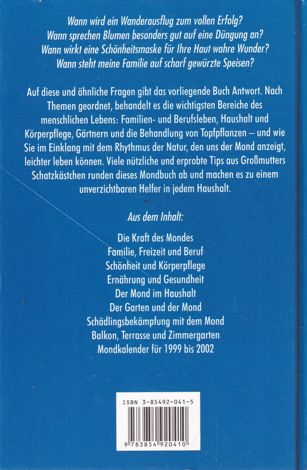 Auf diese und ähnliche Fragen gibt das vorliegende Buch Antwort. Nach Themen geordnet, behandelt es die wichtigsten Bereiche des menschlichen Lebens: Familien- und Berufsleben, Haushalt und Körperpflege, Gärtnern und die Behandlung von Topfpflanzen- und wie Sie im Einklang mit dem Rhythmus der Natur, den uns der Mond anzeigt, leichter leben können. Viele nützliche und erprobte Tips aus Grossmutters Schatzkästchen runden dieses Mondbuch ab und machen es zu einem unverzichtbaren Helfer in jedem Haushalt.