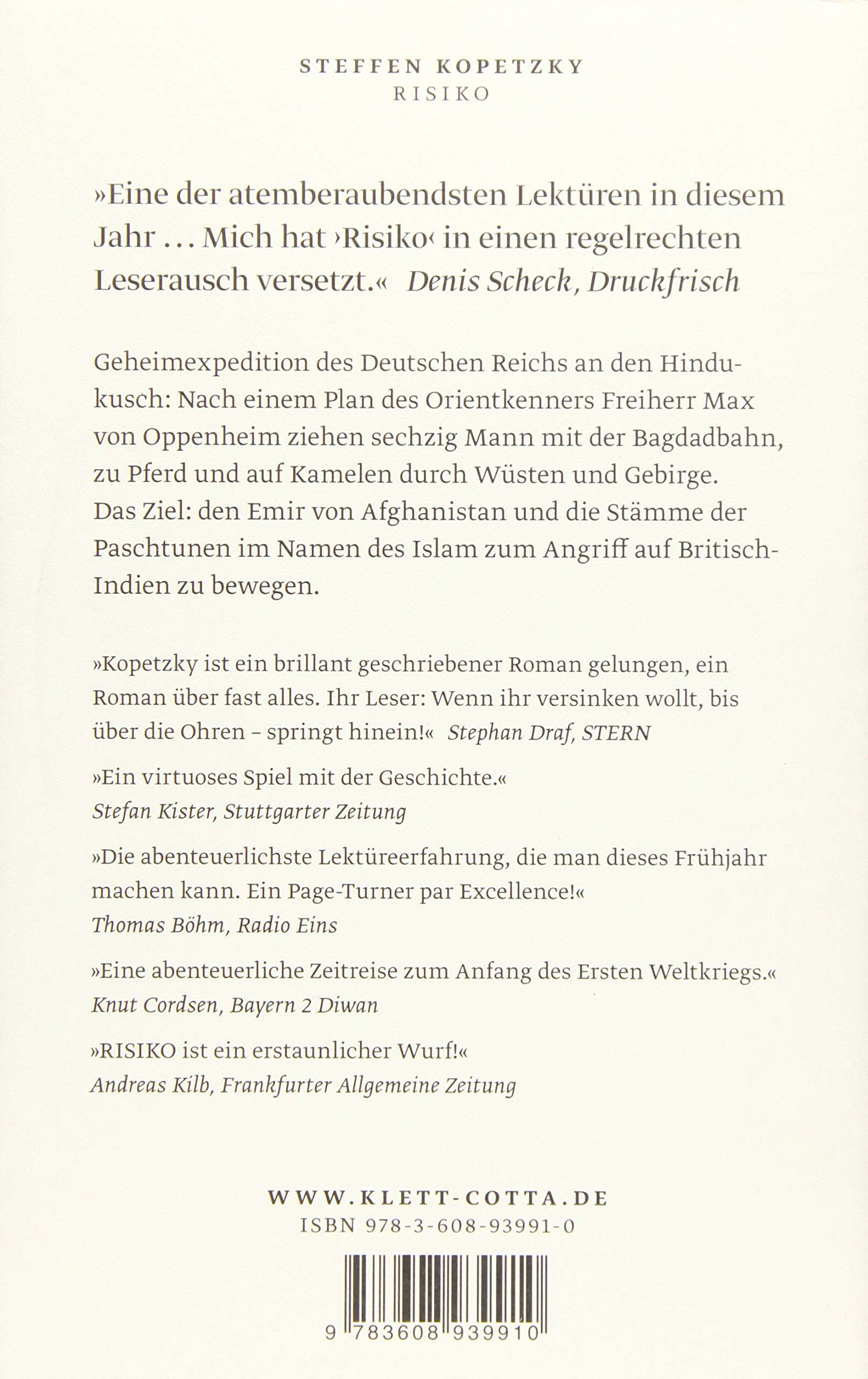 Steffen Kopetzky hat einen funkelnden Abenteuerroman geschrieben, der auf historischen Fakten beruht. Er folgt einer legendären Afghanistan-Expedition auf der 5000 Kilometer langen Reise und begegnet historischen Personen wie Lucien Camus, dem Vater von Albert, oder Alois Musil, auch genannt Musil von Arabien. Geheimexpedition des Deutschen Reichs an den Hindukusch: Nach einem Plan des Orientkenners Freiherr Max von Oppenheim ziehen sechzig Mann mit der Bagdadbahn, zu Pferd und auf Kamelen durch Wüsten und Gebirge. Das Ziel: den Emir von Afghanistan und die Stämme der Paschtunen im Namen des Islam zum Angriff auf Britisch-Indien zu bewegen. Der junge Marinefunker Sebastian Stichnote liegt mit seinem Schiff vor der Küste Albaniens. Aus der Enge der Giesinger Gerberei seiner Brüder hat ihn das Fernweh hinaus auf See und zur vielstimmigen Funktechnik gezogen. Diese gibt ihm das Gefühl, mit dem ganzen Kosmos in Kontakt zu stehen. Als der Erste Weltkrieg beginnt, muss die unterlegene deutsche Flotte durchs Mittelmeer nach Konstantinopel fliehen. Stichnote hat es nach den ersten Seegefechten eilig, sein Schiff so schnell wie möglich zu verlassen und schliesst sich als Funkoffizier einer geheimen Expedition nach Kabul an. Ihre Reise führt sie nach Syrien, Bagdad, Teheran, Isfahan und schliesslich durch die persische Wüste. Am Ende hängt der Erfolg der Expedition von Stichnote ab, der mit allem brechen muss, was ihm einst heilig war.