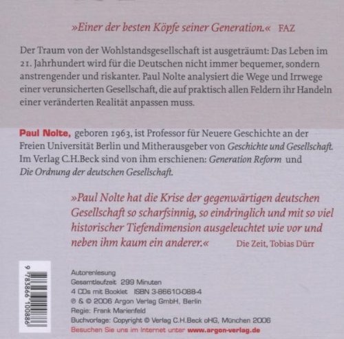 Der Traum von der Wohlstandsgesellschaft ist ausgeträumt: Das Leben im 21. Jahrhundert wird für die Deutschen nicht immer bequemer, sondern anstrengender und riskanter. Paul Nolte analysiert die Wege und Irrwege einer verunsicherten Gesellschaft, die auf praktisch allen Feldern ihr Handeln einer veränderten Realität anpassen muss.