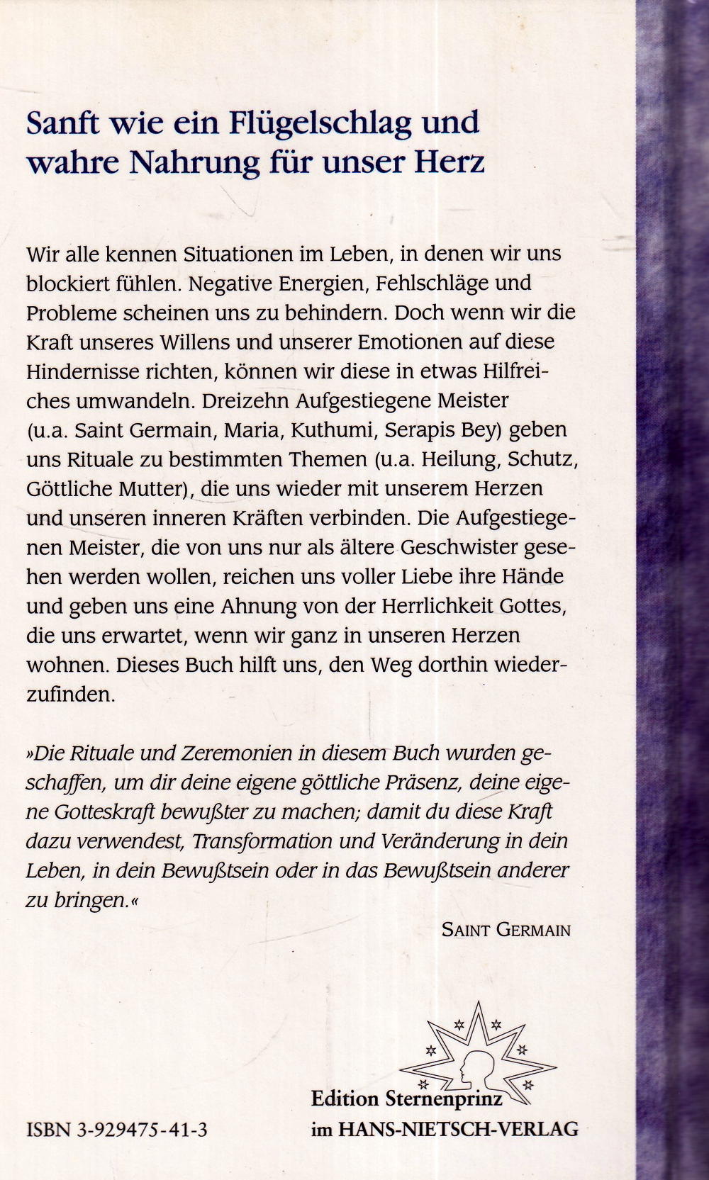 Sanft wie ein Flügelschlag und wahre Nahrung für unser Herz Wir alle kennen Situationen im Leben, in denen wir uns blockiert fühlen. Negative Energien, Fehlschläge und Probleme scheinen uns zu behindern. Doch wenn wir die Kraft unseres Willens und unserer Emotionen auf diese Hindernisse richten, können wir diese in etwas Hilfreiches umwandeln. Dreizehn Aufgestiegene Meister (u.a. Samt Germain, Maria, Kuthumi, Serapis Bey) geben uns Rituale zu bestimmten Themen (u.a. Heilung, Schutz, Göttliche Mutter), die uns wieder mit unserem Herzen und unseren inneren Kräften verbinden. Die Aufgestiegenen Meister, die von uns nur als ältere Geschwister gesehen werden wollen, reichen uns voller Liebe ihre Hände und geben uns eine Ahnung von der Herrlichkeit Gottes, die uns erwartet, wenn wir ganz in unseren Herzen wohnen. Dieses Buch hilft uns, den Weg dorthin wiederzufinden. »Die Rituale und Zeremonien in diesem Buch wurden geschaffen, um dir deine eigene göttliche Präsenz, deine eigene Gotteskraft bewußter zu machen; damit du diese Kraft dazu verwendest, Transformation und Veränderung in dein Leben, in dein Bewußtsein oder in das Bewußtsein anderer zu bringen. «