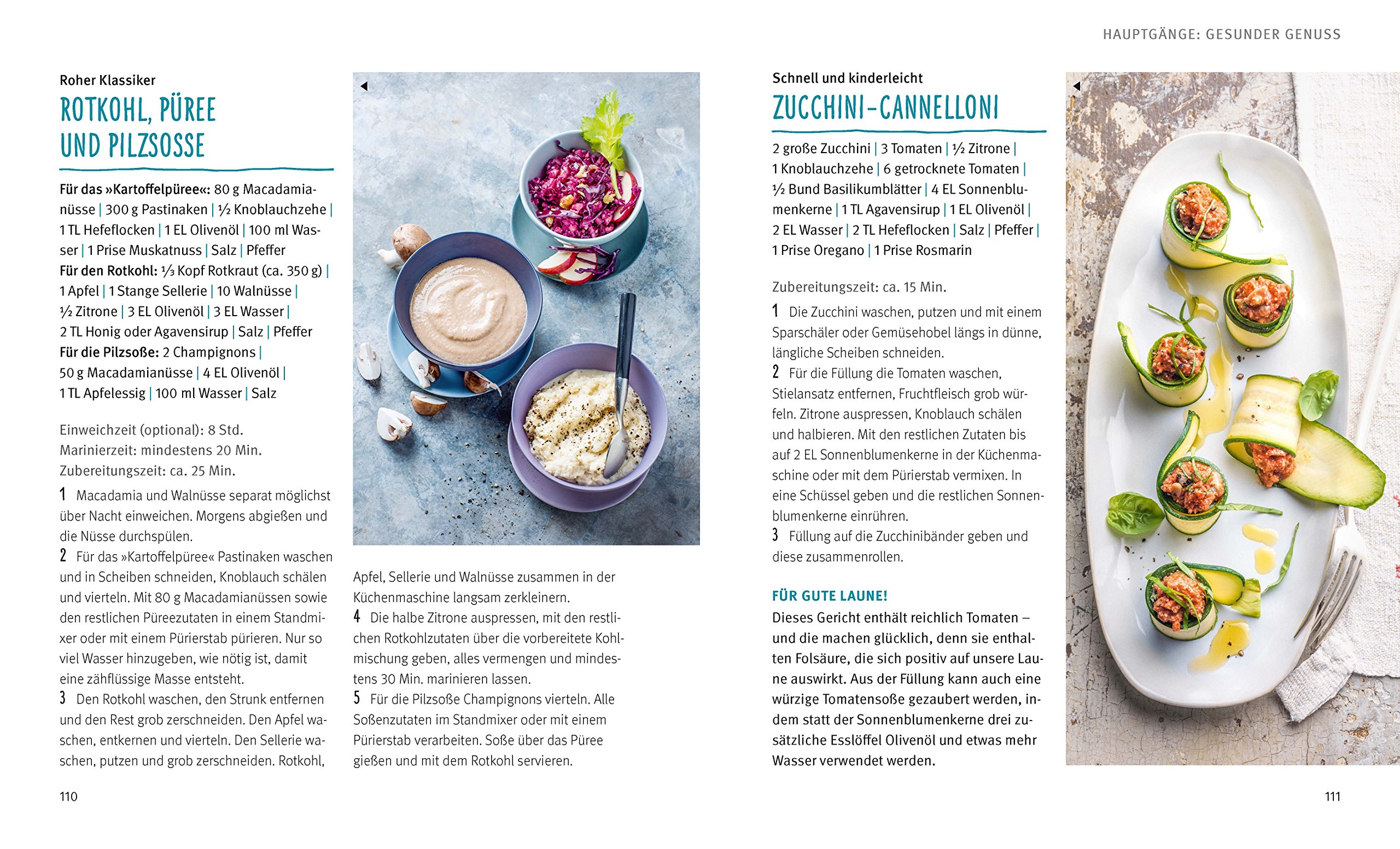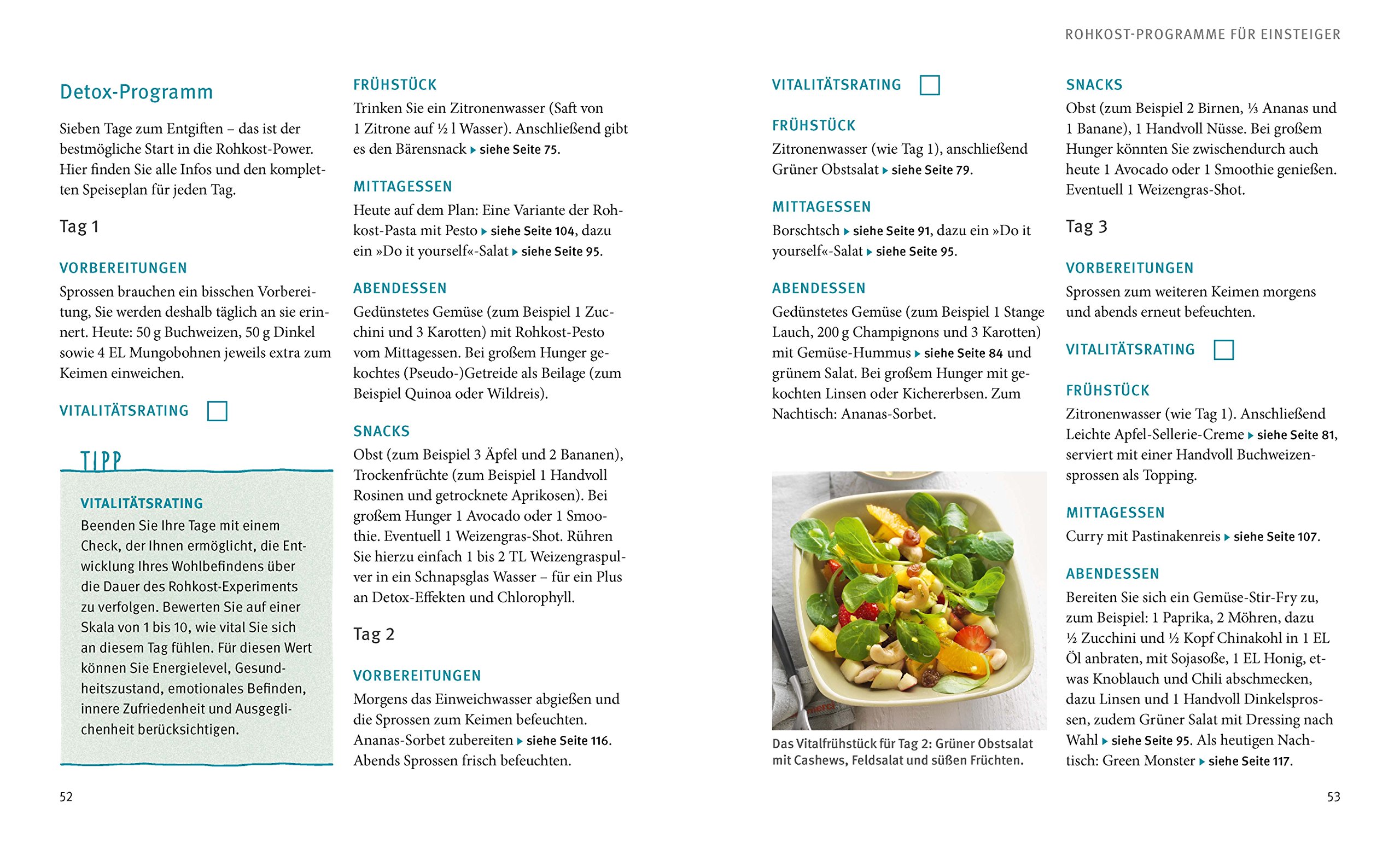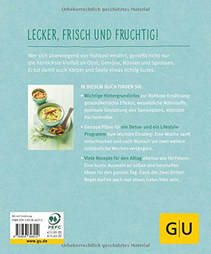 Die Ernährung mit rohen Früchten und Pflanzen ist so alt wie die Menschheit selbst. Der Ratgeber zeigt, wie sich auch heute der positive Effekt von Rohkost auf Gesundheit und Wohlbefinden mit kulinarischer Abwechslung und Kreativität in der Küche verbinden lässt. Dank Rohkost bleiben Vitamine, Mineralstoffe und Enzyme im Lebensmittel erhalten. Aufgrund der vielen Ballaststoffe verbessert sich die Darmfunktion und der Cholesterinspiegel sinkt. Ausserdem ist Rohkost von Natur aus kalorienarm und hilft so beim Abnehmen. Die Autorin Chantal Sandjon präsentiert das neue, rohe Lebensgefühl undogmatisch, alltagstauglich und mit Genuss-Garantie! Das ein- bzw. dreiwöchige Rohkost-Programm erleichtert den Einstieg ohne zu überfordern, denn es bietet auch Raum für Gekochtes, dank der Zwei-Drittel-Regel. Mehr als 60 süsse und herzhafte Rezepte beweisen wie abwechslungreich Rohkost sein kann.