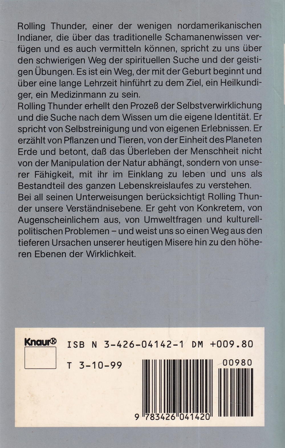 Rolling Thunder, einer der wenigen nordamerikanischen Indianer, die über das traditionelle Schamanenwissen verfügen und es auch vermitteln können, spricht zu uns über den schwierigen Weg der spirituellen Suche und der geistigen Übungen. Es ist ein Weg, der mit der Geburt beginnt und über eine lange Lehrzeit hinführt zu dem Ziel, ein Heilkundiger, ein Medizinmann zu sein.