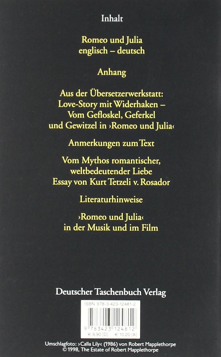 Mit einem Essay von Kurt Tetzeli Romeo und Julia: die Namen stehen längst für einen Mythos, den Mythos der tragischen Leidenschaft. Die Geschichte hat unzählige Nachahmer gefunden, und der Aufruhr der Gefühle darin gehört heute, trivialisiert und ausschnittsweise, zum Repertoire nicht weniger Seifenopern: der tödliche Zwist zweier Familien; der Blitzschlag der unerlaubten Liebe zwischen den Kindern dieser Häuser; das Ungestüm und die Zärtlichkeit, mit denen sich beide dieser Liebe versichern; der Todesmut, mit dem Julia in den Plan einwilligt, sich als Scheintote "entführen" zu lassen, um damit einer anderweitigen Vermählung zu entgehen und Romeo nachzufolgen. Und dann natürlich die tragischste aller Szenen, der Liebestod: Romeo, durch einen fatalen Zufall nur unzureichend über den Plan informiert, glaubt Julia tot und vergiftet sich in ihrer Gruft; Julia erwacht und ersticht sich mit Romeos Dolch.