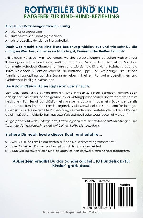Sei gespannt auf viele Hintergründe, Erfahrungsberichte, Schritt-für-Schritt-Anleitungen und Tipps, die sich massgeschneidert auf Deinen Rottweiler beziehen. Sichere Dir noch heute dieses Buch und erfahre......wie Du Deine Familie am besten auf den Neuankömmling vorbereitest,...wie Du Beissen, Knurren und Angst von Anfang an vermeidest … und wie Du sowohl Dein Kind als auch Deinen Rottweiler füreinander begeisterst. Ausserdem erhältst Du das Sonderkapitel „10 Hundetricks für Kinder“ gratis dazu!