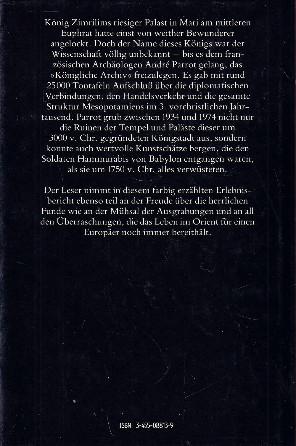 König Zimrilims riesiger Palast in Mari am mittleren Euphrat hatte einst von weither Bewunderer angelockt. Doch der Name dieses Königs war der Wissenschaft völlig unbekannt – bis es dem französischen Archäologen André Parrot gelang, das »Königliche Archiv« freizulegen. Es gab mit rund 25000 Tontafeln Aufschluss über die diplomatischen Verbindungen, den Handelsverkehr und die gesamte Struktur Mesopotamiens im 3. Vorchristlichen Jahrtausend. Parrot grub zwischen 1934 und 1974 nicht nur die Ruinen der Tempel und Paläste dieser um 3000 v. Chr. Gegründeten Königstadt aus, sondern konnte auch wertvolle Kunstschätze bergen, die den Soldaten Hammurabis von Babylon entgangen waren, als sie um 1750 v. Chr. Alles verwüsteten.