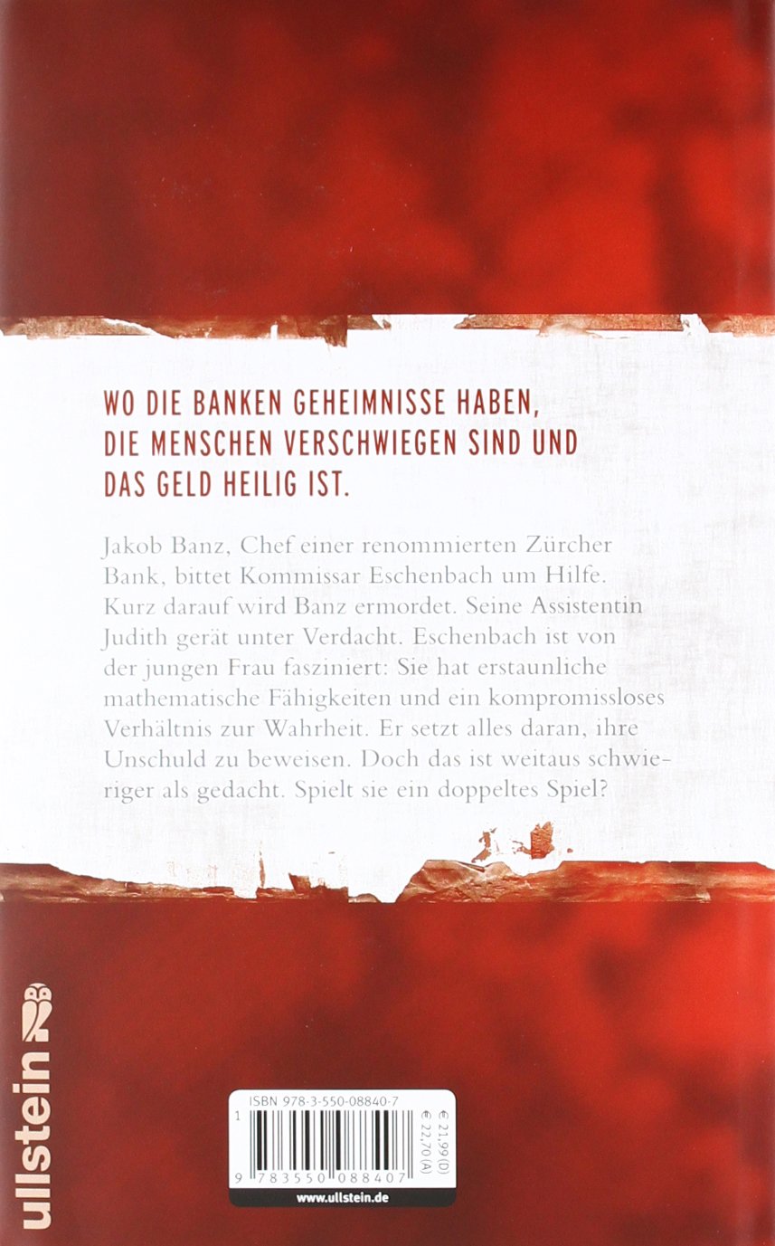 'In einer renommierten Zürcher Privatbank verschwindet ein Mitarbeiter spurlos. Der Chef der Bank, Jakob Banz, bittet seinen alten Schulfreund Kommissar Eschenbach um Hilfe. Kurz darauf wird Banz ermordet. Die Computerspezialistin Judith gerät in Verdacht, sie soll ein Verhältnis mit Banz gehabt haben. Eschenbach ist von ihr fasziniert: Sie hat erstaunliche mathematische Fähigkeiten und ein kompromissloses Verhältnis zur Wahrheit. Eschenbach setzt alles daran, Judiths Unschuld zu beweisen. Doch das ist weitaus schwieriger als gedacht. Spielt sie ein doppeltes Spiel? Mit seinem neuen hochaktuellen Roman taucht Michael Theurillat tief ein in das Schattenreich der internationalen Finanzwelt.
