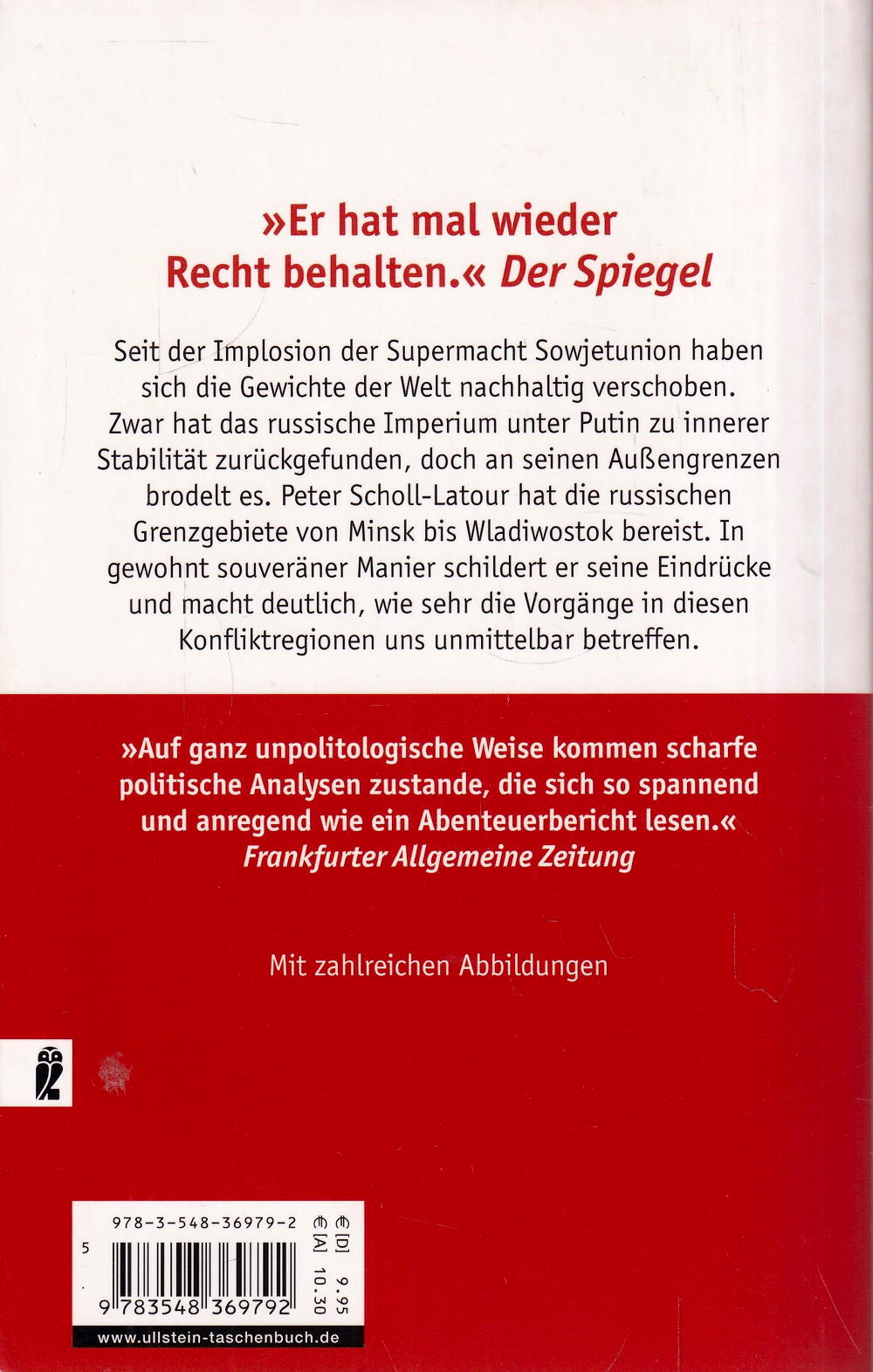 Seit der Implosion der Supermacht Sowjetunion haben sich die Gewichte der Welt nachhaltig verschoben. Zwar hat das russische Imperium unter Putin zu innerer Stabilität zurückgefunden, doch an seinen Aussengrenzen brodelt es. Peter Scholl-Latour hat die russischen Grenzgebiete von Minsk bis Wladiwostok bereist. In gewohnt souveräner Manier schildert er seine Eindrücke und macht deutlich, wie sehr die Vorgänge in diesen Konfliktregionen uns unmittelbar betreffen.