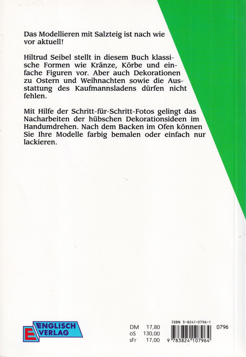 Das Modellieren mit Salzteig ist nach wie vor aktuell! Hiltrud Seibel stellt in diesem Buch klassische Formen wie Kränze, Körbe und einfache Figuren vor. Aber auch Dekorationen zu Ostern und Weihnachten sowie die Ausstattung des Kaufmannsladens dürfen nicht fehlen. Mit Hilfe der Schritt-für-Schritt-Fotos gelingt das Nacharbeiten der hübschen Dekorationsideen im Handumdrehen. Nach dem Backen im Ofen können Sie Ihre Modelle farbig bemalen oder einfach nur lackieren.