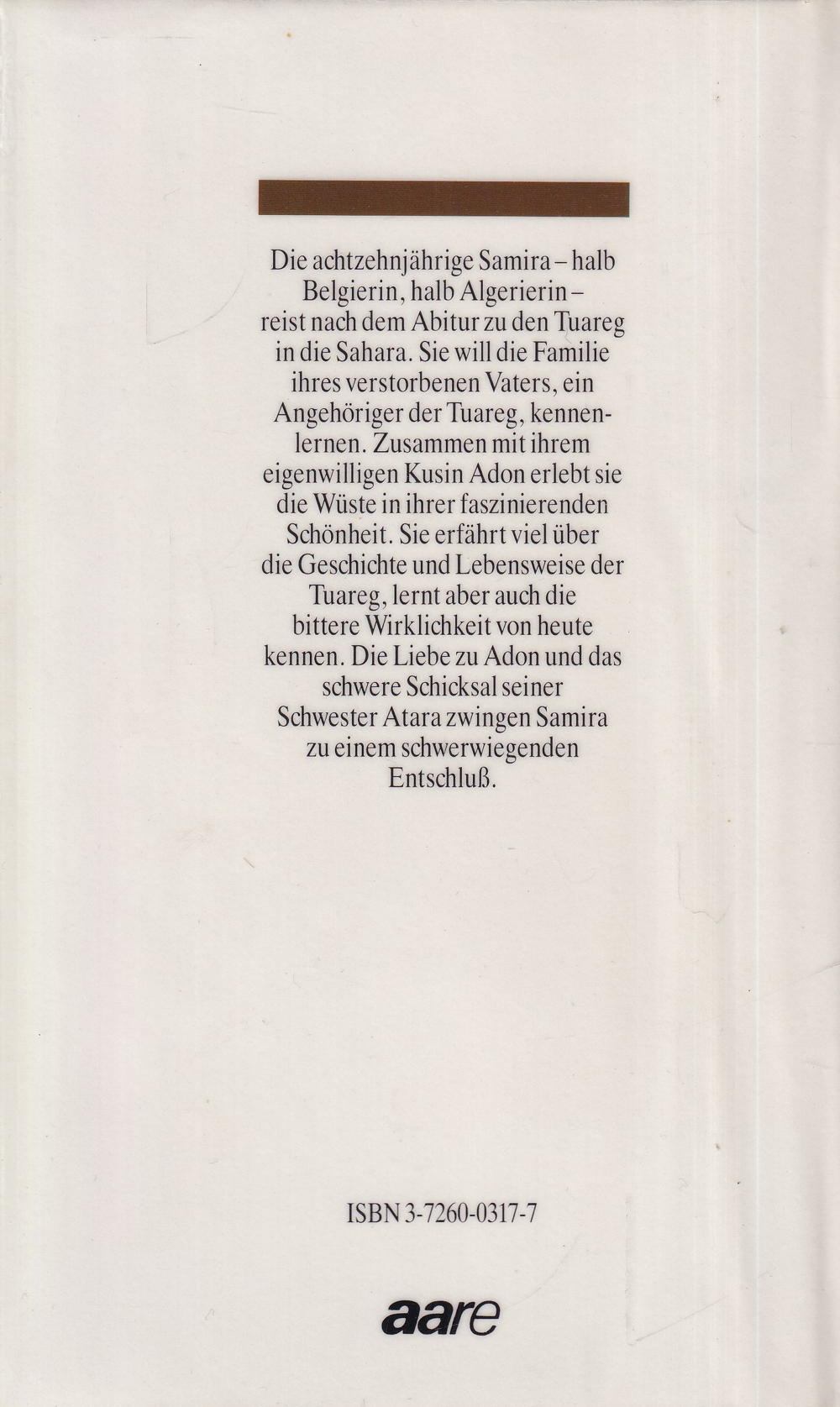 Die achtzehnjährige Samira- halb Belgierin, halb Algerierinreist nach dem Abitur zu den Tuareg in die Sahara. Sie will die Familie ihres verstorbenen Vaters, ein Angehöriger der Tuareg, kennenlernen. Zusammen mit ihrem eigenwilligen Kusin Adon erlebt sie die Wüste in ihrer faszinierenden Schönheit. Sie erfährt viel über die Geschichte und Lebensweise der Tuareg, lernt aber auch die bittere Wirklichkeit von heute kennen. Die Liebe zu Adon und das schwere Schicksal seiner Schwester Atara zwingen Samira zu einem schwerwiegenden Entschluss.