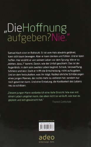 Samuel Koch sitzt im Rollstuhl. Er ist vom Hals abwärts gelähmt. Er kann noch nicht mal allein essen. Aber er kann denken und fühlen. Und er kann hoffen. Hier erzählt er von seinem Leben vor dem Sprung: wie er zu "Wetten dass ..?" kommt. Davon, wie der Unfall geschieht. Das ist der Augenblick, in dem sein zweites Leben beginnt: Schock, Verzweiflung, Schmerz und Wut. Doch er trifft die Entscheidung, nicht aufzugeben. Und an dem Glauben festzuhalten, der ihn trägt. Radikal ehrliche Schilderungen eines jungen Mannes, der nichts mehr zu verlieren hat, sondern nur noch gewinnen kann. Und eine Einladung, die Kostbarkeit des Lebens neu zu schätzen. Mit einem Vorwort von Thomas Gottschalk und einem Nachwort von Michelle Hunziker.