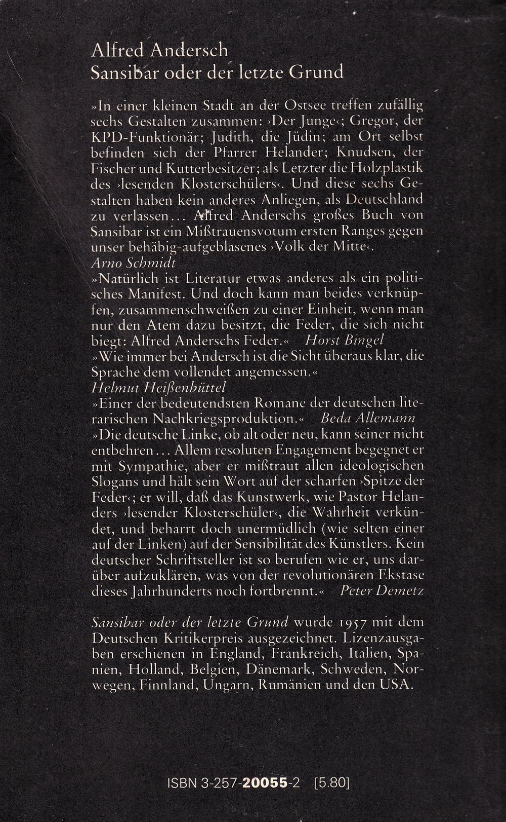In der kleinen Stadt an der Ostsee treffen zufällig sechs Gestalten zusammen: Der Junge Gregor, der KPD-Funktionär; Judith, die Jüdin; am Ort selbst befinden sich Pfarrer Helander; Knudsen der Fischer und Kutterbesitzer; als letzter die Holzplastik des lesenden Klosterschülers. Und die sechs Gestalten haben kein anderes Anliegen, als Deutschland zu verlassen. Anderschs grosses Buch von Sansibar ist Misstrauensvotum ersten Ranges gegen unser behäbig-aufgeblasenes Volk der Mitte.