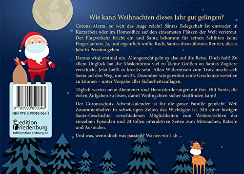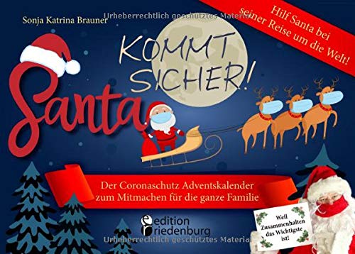Der Coronaschutz Adventskalender ist für die ganze Familie gemacht. Weil Zusammenhalten in schwierigen Zeiten das Wichtigste ist. Mit einer lustigen Santa-Geschichte, verschiedenen Möglichkeiten zum Weitererzählen der einzelnen Episoden und 24 tollen interaktiven Seiten zum Mitmachen, Rätseln und Ausmalen.