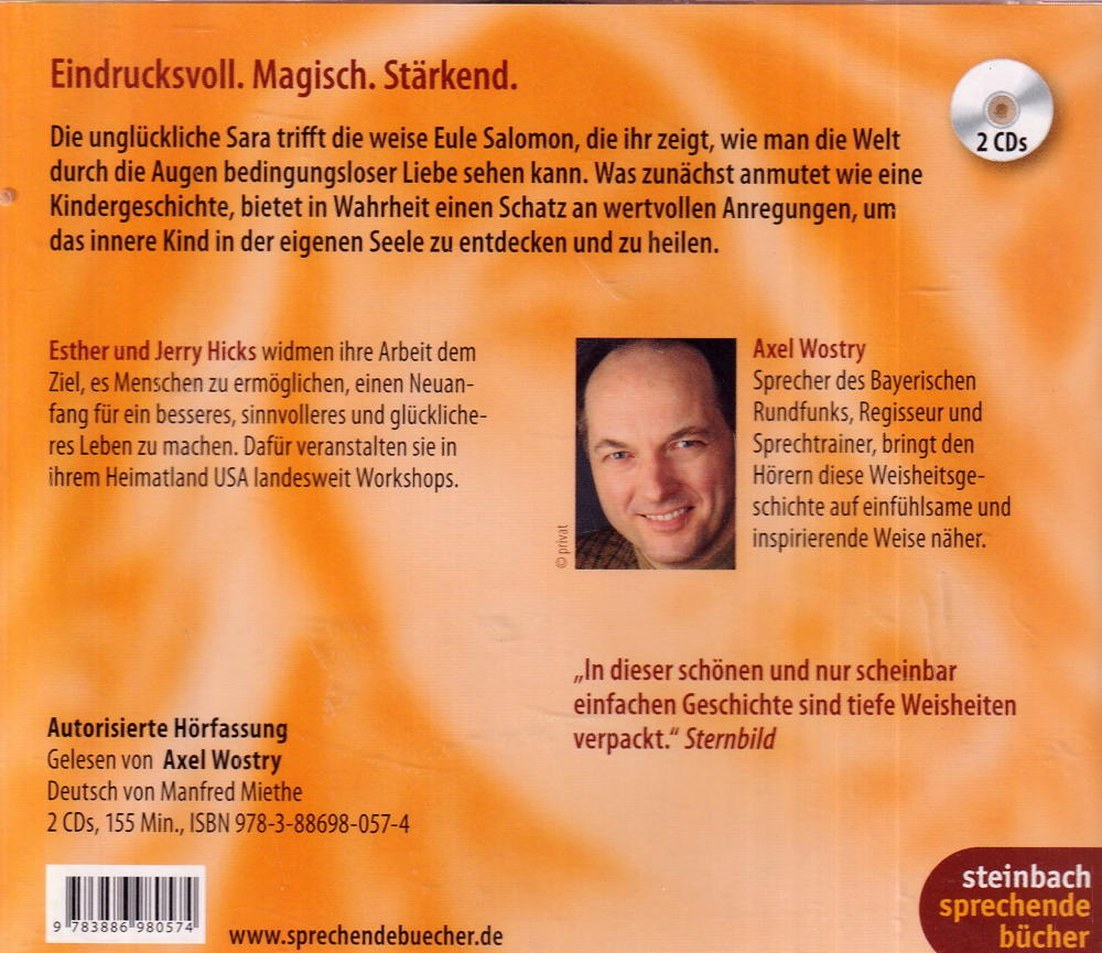 Die unglückliche Sara trifft die weise Eule Salomon, die ihr zeigt, wie man die Welt durch die Augen bedingungsloser Liebe sehen kann. Was zunächst anmutet wie eine Kindergeschichte, bietet in Wahrheit einen Schatz an wertvollen Anregungen, um das innere Kind in der eigenen Seele zu entdecken und zu heilen.