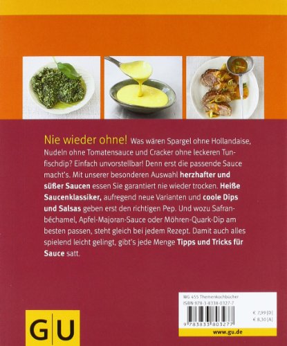 Nie wieder ohne! Was wären Spargel ohne Hollandaise, Nudeln ohne Tomatensauce und Cracker ohne leckeren Tunfischdip? Einfach unvorstellbar! Denn erst die passende Sauce macht's. Mit unserer besonderen Auswahl herzhafter und süsser Saucen essen Sie garantiert nie wieder trocken. Heisse Saucenklassiker, aufregend neue Varianten und coole Dips und Salsas geben erst den richtigen Pep. Und wozu Safranbéchamel, Apfel-Majoran-Sauce oder Möhren-Quark-Dip am besten passen, steht gleich bei jedem Rezept. Damit auch alles spielend leicht gelingt, gibt's jede Menge Tipps und Tricks für Sauce satt.