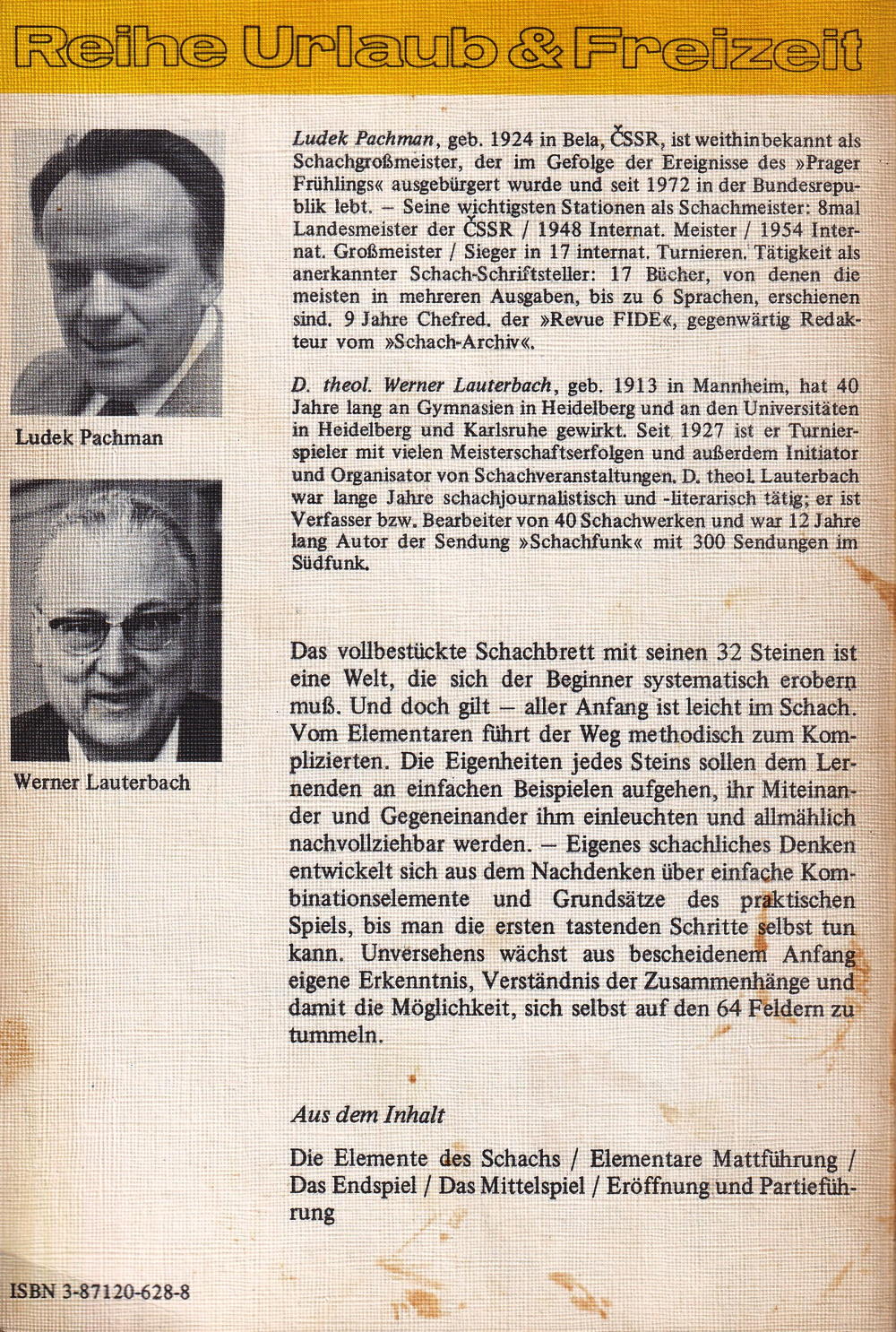 Vom Elementaren führt der Weg methodisch zum Komplizierten. Die Eigenheiten jedes Steins sollen dem Lernenden an einfachen Beispielen aufgehen, ihr Miteinander und Gegeneinander ihm einleuchten und allmählich nachvollziehbar werden. - Eigenes schachliches Denken entwickelt sich aus dem Nachdenken über einfache Kombinationselemente und Grundsätze des praktischen Spiels, bis man die ersten tastenden Schritte selbst tun kann. Unversehens wächst aus bescheidenem Anfang eigene Erkenntnis, Verständnis der Zusammenhänge und damit die Möglichkeit, sich selbst auf den 64 Feldern tummeln.