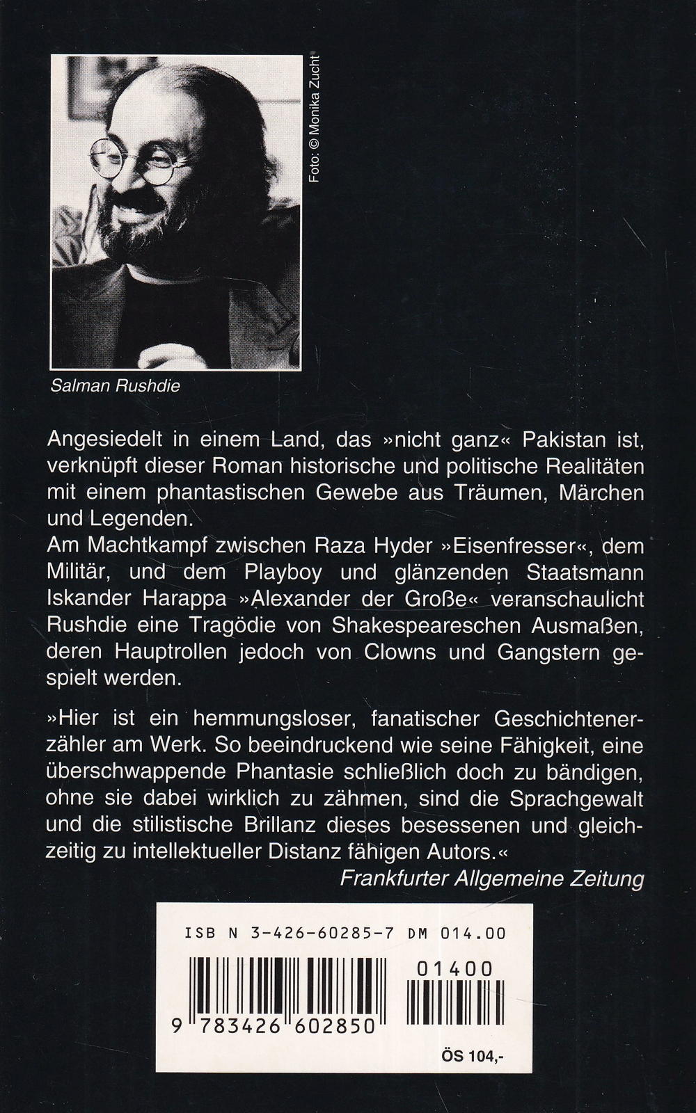 Am Machtkampf zwischen Raza Hyder »Eisenfresser«, dem Militär, und dem Playboy und glänzenden Staatsmann Iskander Harappa »Alexander der Grosse« veranschaulicht Rushdie eine Tragödie von Shakespeareschen Ausmassen, deren Hauptrollen jedoch von Clowns und Gangstern gespielt werden.