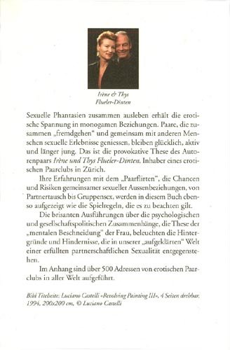 Sexuelle Phantasien gemeinsam ausleben erhält die erotische Spannung in monogamen Beziehungen. Paare, die zusammen fremdgehen und gemeinsam mit anderen Menschen sexuelle Erlebnisse geniessen, bleiben glücklich, aktiv und länger jung. Anhang mit über 500 Adressen von erotischen Paarclubs in aller Welt.