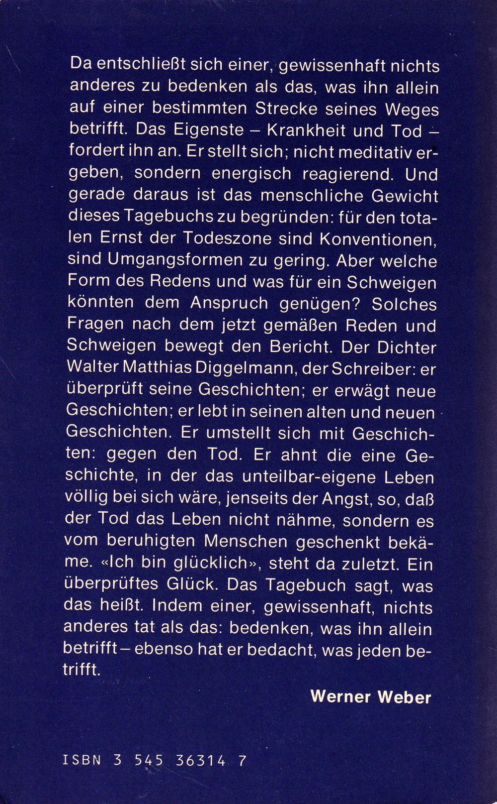Der Dichter Walter Matthias Diggelmann, der Schreiber: er überprüft seine Geschichten; er erwägt neue Geschichten; er lebt in seinen alten und neuen Geschichten. Er umstellt sich mit Geschichten: gegen den Tod. Er ahnt die eine Geschichte, in der das unteilbar-eigene Leben völlig bei sich wäre, jenseits der Angst, so, dass der Tod das Leben nicht nähme, sondern es vom beruhigten Menschen geschenkt bekäme. «Ich bin glücklich», steht da zuletzt. Ein überprüftes Glück. Das Tagebuch sagt, was das heisst. Indem einer, gewissenhaft, nichts anderes tat als das: bedenken, was ihn allein betrifft- ebenso hat er bedacht, was jeden betrifft.