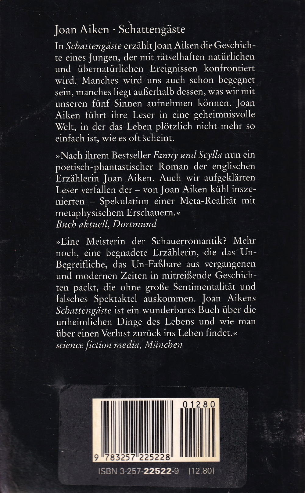 In Schattengäste erzählt Joan Aiken die Geschichte eines Jungen, der mit rätselhaften natürlichen und übernatürlichen Ereignissen konfrontiert wird. Manches wird uns auch schon begegnet sein, manches liegt außerhalb dessen, was wir mit unseren fünf Sinnen aufnehmen können. Joan Aiken führt ihre Leser in eine geheimnisvolle Welt, in der das Leben plötzlich nicht mehr so einfach ist, wie es oft scheint.