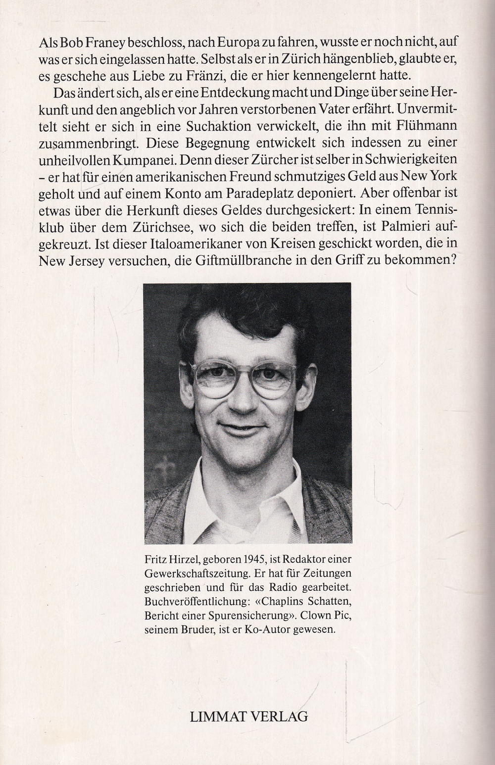 Das ändert sich, als er eine Entdeckung macht und Dinge über seine Herkunft und den angeblich vor Jahren verstorbenen Vater erfährt. Unvermittelt sieht er sich in eine Suchaktion verwickelt, die ihn mit Flühmann zusammenbringt. Diese Begegnung entwickelt sich indessen zu einer unheilvollen Kumpanei. Denn dieser Zürcher ist selber in Schwierigkeiten - er hat für einen amerikanischen Freund schmutziges Geld aus New York geholt und auf einem Konto am Paradeplatz deponiert. Aber offenbar ist etwas über die Herkunft dieses Geldes durchgesickert: In einem Tennisklub über dem Zürichsee, wo sich die beiden treffen, ist Palmieri aufgekreuzt. Ist dieser Italoamerikaner von Kreisen geschickt worden, die in New Jersey versuchen, die Giftmüllbranche in den Griff zu bekommen?