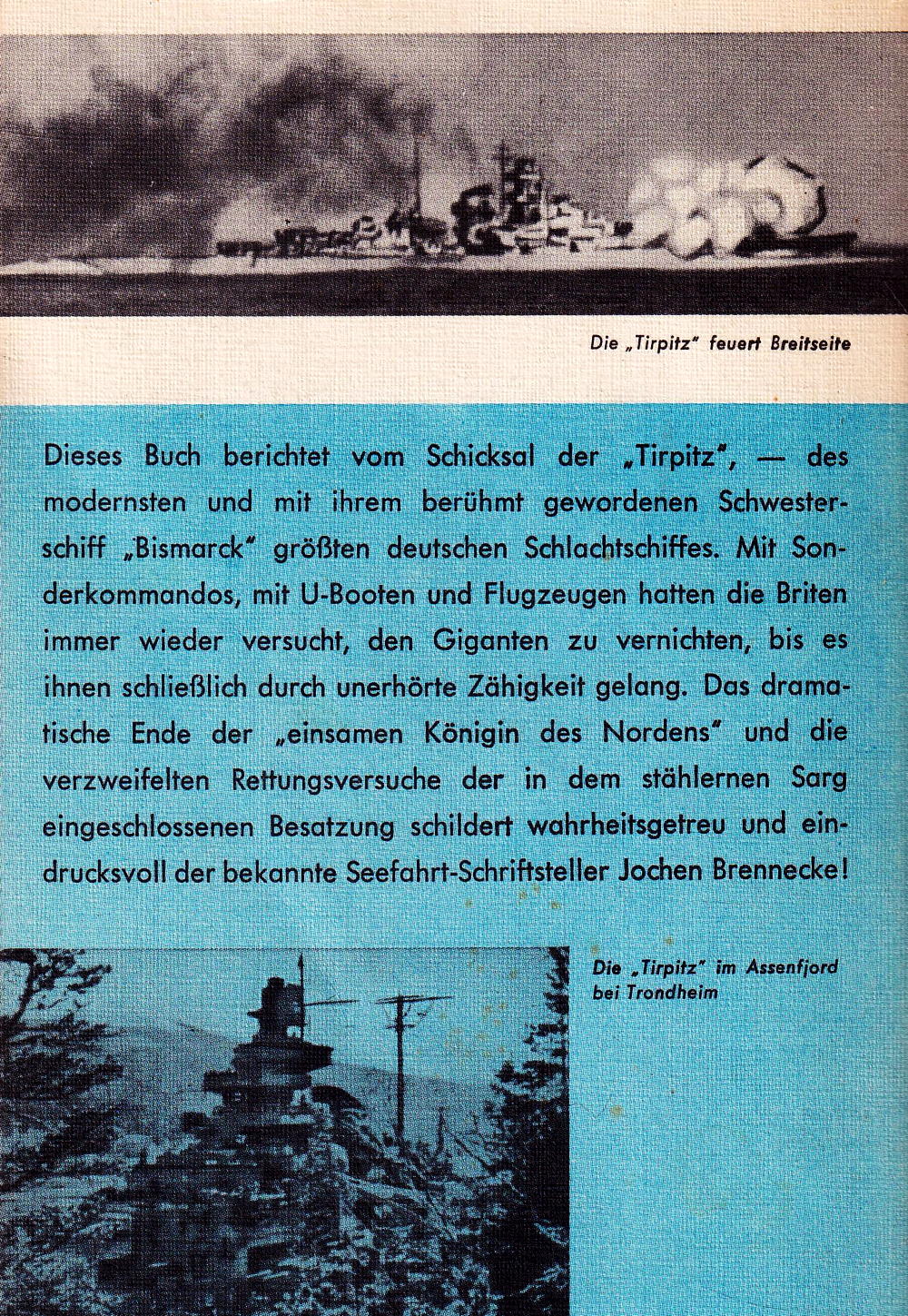 Dieses Buch berichtet vom Schicksal der „Tirpitz", des modernsten und mit ihrem berühmt gewordenen Schwesterschiff „Bismarck" grössten deutschen Schlachtschiffes. Mit Sonderkommandos, mit U-Booten und Flugzeugen hatten die Briten immer wieder versucht, den Giganten zu vernichten, bis es ihnen schliesslich durch unerhörte Zähigkeit gelang. Das dramatische Ende der einsamen Königin des Nordens" und die verzweifelten Rettungsversuche der in dem stählernen Sarg eingeschlossenen Besatzung schildert wahrheitsgetreu und eindrucksvoll der bekannte Seefahrt-Schriftsteller Jochen Brennecke!