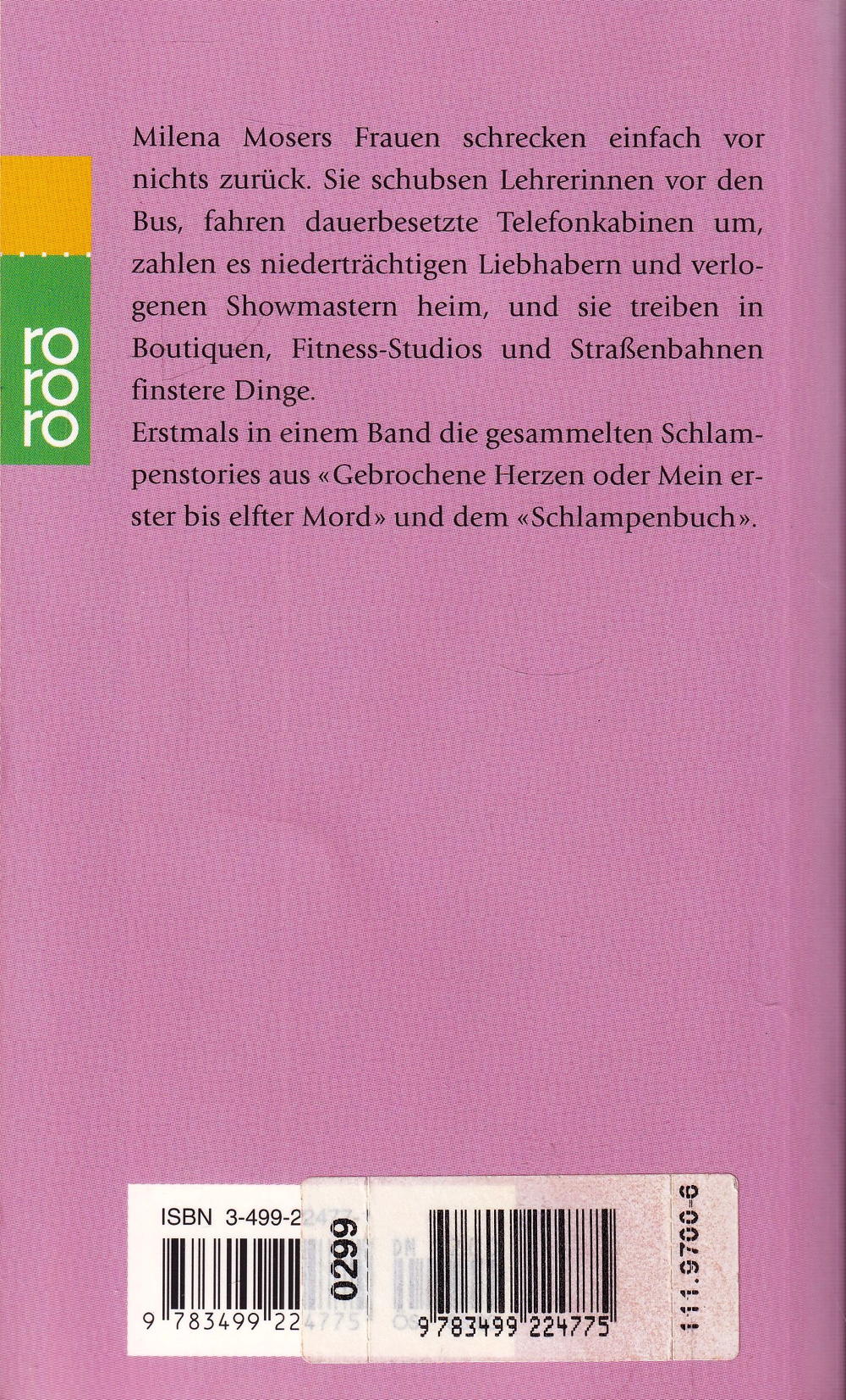 Milena Mosers Frauen schrecken vor nichts zurück. Sie schubsen Lehrerinnen vor den Bus, fahren dauerbesetzte Telefonkabinen um, zahlen es niederträchtigen Liebhabern und verlogenen Showmastern heim, und sie treiben in Boutiquen, Fitness-Studios und Strassenbahnen finstere Dinge. Erstmals die gesammelten Schlampenstories in einem Band!