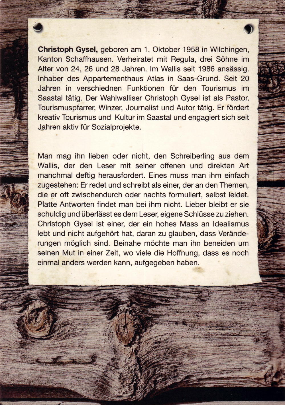 Christoph Gysel, geboren am 1. Oktober 1958 in Wilchingen, Kanton Schaffhausen. Verheiratet mit Regula, drei Söhne im Alter von 24, 26 und 28 Jahren. Im Wallis seit 1986 ansässig.