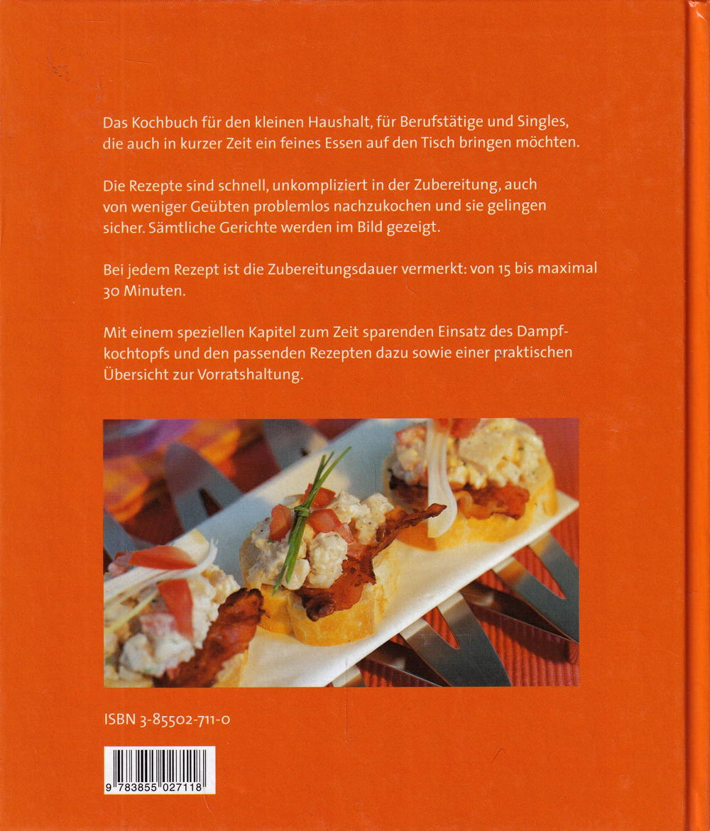 Das Kochbuch für den kleinen Haushalt, für Berufstätige und Singles, die auch in kurzer Zeit ein feines Essen auf den Tisch bringen möchten.