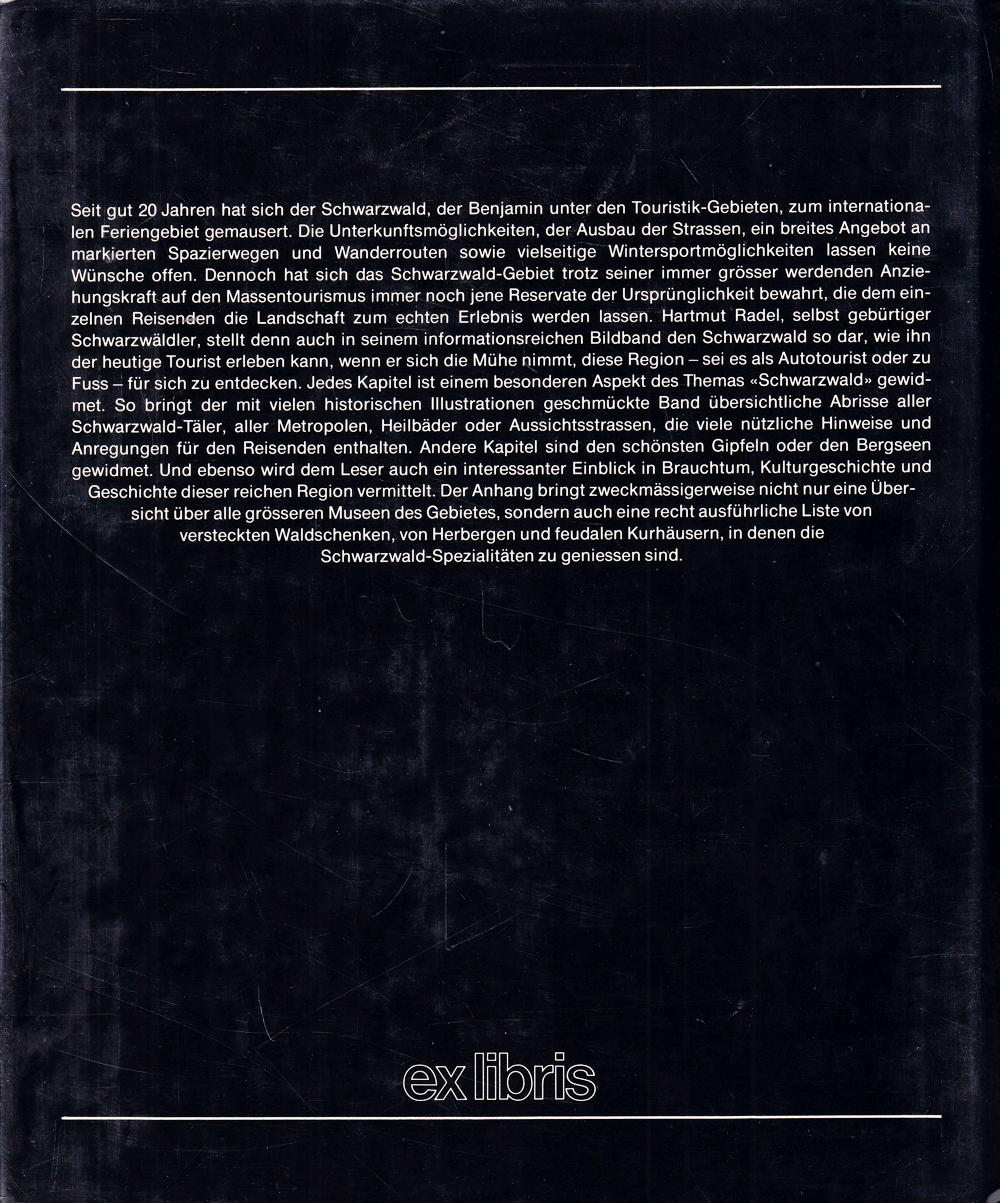 Seit gut 20 Jahren hat sich der Schwarzwald, der Benjamin unter den Touristik-Gebieten, zum internationalen Feriengebiet gemausert. Die Unterkunftsmöglichkeiten, der Ausbau der Strassen, ein breites Angebot an markierten Spazierwegen und Wanderrouten sowie vielseitige Wintersportmöglichkeiten lassen keine Wünsche offen. Dennoch hat sich das Schwarzwald-Gebiet trotz seiner immer grösser werdenden Anziehungskraft auf den Massentourismus immer noch jene Reservate der Ursprünglichkeit bewahrt, die dem einzelnen Reisenden die Landschaft zum echten Erlebnis werden lassen. Hartmut Radel, selbst gebürtiger Schwarzwäldler, stellt denn auch in seinem informationsreichen Bildband den Schwarzwald so dar, wie ihn der heutige Tourist erleben kann, wenn er sich die Mühe nimmt, diese Region – sei es als Autotourist oder zu Fuss – für sich zu entdecken. Jedes Kapitel ist einem besonderen Aspekt des Themas «Schwarzwald» gewidmet. So bringt der mit vielen historischen Illustrationen geschmückte Band übersichtliche Abrisse aller Schwarzwald-Täler, aller Metropolen, Heilbäder oder Aussichtsstrassen, die viele nützliche Hinweise und Anregungen für den Reisenden enthalten. Andere Kapitel sind den schönsten Gipfeln oder den Bergseen gewidmet. Und ebenso wird dem Leser auch ein interessanter Einblick in Brauchtum, Kulturgeschichte und Geschichte dieser reichen Region vermittelt. Der Anhang bringt zweckmässigerweise nicht nur eine Übersicht über alle grösseren Museen des Gebietes, sondern auch eine recht ausführliche Liste von versteckten Waldschenken, von Herbergen und feudalen Kurhäusern, in denen die Schwarzwald-Spezialitäten zu geniessen sind.
