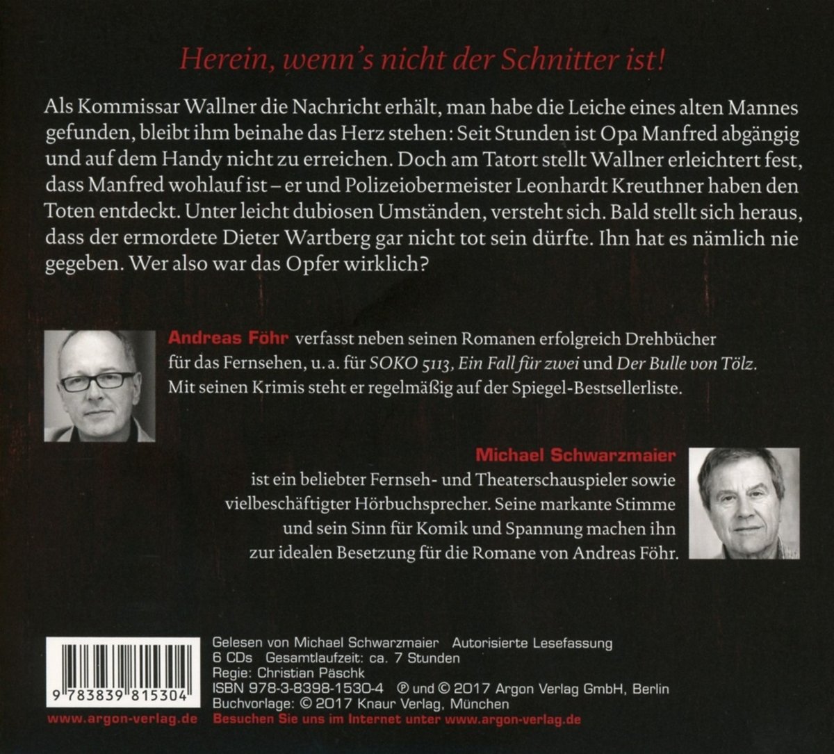 Polizeiobermeister Kreuthner will zum Faschingsball in der Mangfall-Mühle. Da er leider seinen Führerschein abgeben musste, lässt er sich, zusammen mit ein paar leicht bekleideten Damen in Glitzerkostümen, von Opa Manfred zum Faschingsball kutschieren. Doch Opa Manfred – im Kostüm des Gevatters Tod – ist nicht mehr der Jüngste und weder orientierungssicher noch wirklich fahrtauglich. Er kutschiert die Truppe in den Graben. Irgendwo in der oberbayerischen Pampa machen sich die wild verkleideten Gestalten auf die Suche nach Hilfe. In einem abgelegenen Haus öffnet ihnen schliesslich eine Frau mit einem Messer in der Hand die Tür. Hinter ihr liegt die Leiche eines Mannes. Lara Evers steht unter Schock und weiss nicht mehr, was passiert ist. Auch sonst scheint niemand den Toten zu kennen … Michael Schwarzmaier ist ein beliebter Fernseh- und Theaterschauspieler und ein vielbeschäftigter Hörbuchsprecher. Seine markante Stimme und sein Sinn für Komik und Spannung machen ihn zur idealen Besetzung für die Romane von Andreas Föhr.