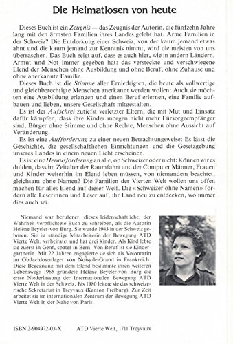 Es ist eine Herausforderung an alle, ob Schweizer oder nicht: Können wir es dulden, dass im Zeitalter der Raumfahrt und der Computer Männer, Frauen und Kinder weiterhin im Elend leben müssen, von niemandem beachtet, gleichsam ohne Namen? Die Familien der Vierten Welt wollen uns offen machen für alles Elend auf dieser Welt. Die «Schweizer ohne Namen» fordern alle Leserinnen und Leser auf, ihr Land neu zu entdecken, wo immer dies auch sei.