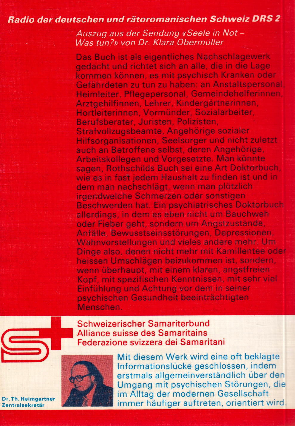 Das Buch ist als eigentliches Nachschlagewerk gedacht und richtet sich an alle, die in die Lage kommen können, es mit psychisch Kranken oder Gefährdeten zu tun zu haben: an Anstaltspersonal Heimleiter, Pflegepersonal, Gemeindehelferinnen Arztgehilfinnen, Lehrer, Kindergärtnerinnen, Hortleiterinnen, Vormünder, Sozialarbeiter, Berufsberater, Juristen, Polizisten, Strafvollzugsbeamte, Angehörige sozialer Hilfsorganisationen, Seelsorger und nicht zuletzt auch an Betroffene selbst, deren Angehörige, Arbeitskollegen und Vorgesetzte. Man könnte sagen, Rothschilds Buch sei eine Art Doktorbuch, wie es in fast jedem Haushalt zu finden ist und in dem man nachschlägt, wenn man plötzlich irgendwelche Schmerzen oder sonstigen Beschwerden hat. Ein psychiatrisches Doktorbuch allerdings, in dem es eben nicht um Bauchweh oder Fieber geht, sondern um Angstzustände, Anfälle, Bewusstseinsstörungen, Depressionen, Wahnvorstellungen und vieles andere mehr. Um Dinge also, denen nicht mehr mit Kamillentee oder heissen Umschlägen beizukommen ist, sondern, wenn überhaupt, mit einem klaren, angstfreien Kopf, mit spezifischen Kenntnissen, mit sehr viel Einfühlung und Achtung vor dem in seiner psychischen Gesundheit beeinträchtigten Menschen.