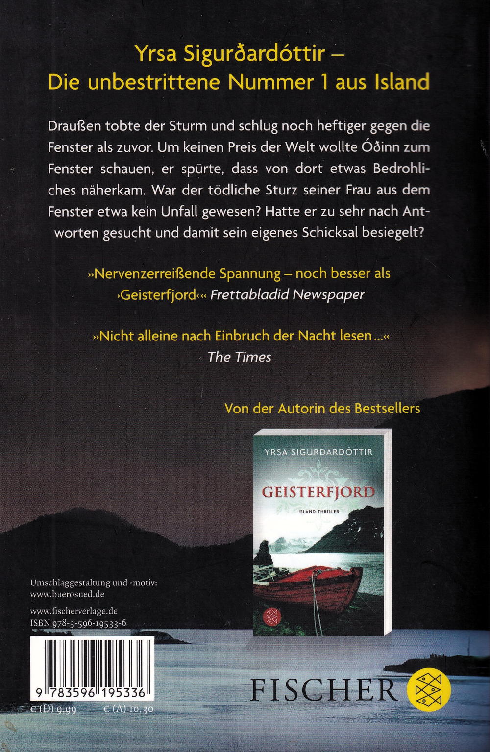 Yrsa Sigurðardóttir studierte Bauingenieurwesen in Reykjavík und Montreal. Seit 1998 schreibt sie Kinderbücher, im Jahre 2005 erschien ihr erster Kriminalroman »Das letzte Ritual«. Ihre Bücher sind mittlerweile in 30 Sprachen übersetzt. Neben dem Schreiben arbeitet sie als Ingenieurin in Reykjavík. Literaturpreise: 2000 IBBY Honour List (International Board on Books for Young People) für Við viljum jólin í júlí2011 Blóðdropinn (nationaler isländischer Preis für Kriminalliteratur) für Ég man þig (dt. Geisterfjord. Fischer, Frankfurt/M. 2011)