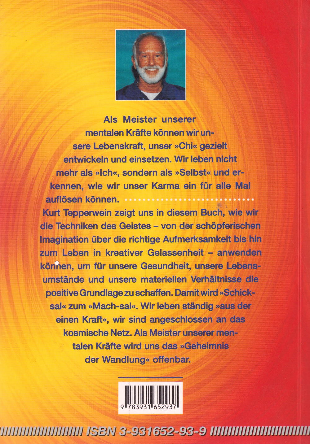 Kurt Tepperwein zeigt uns in diesem Buch, wie wir die Techniken des Geistes - von der schöpferischen Imagination über die richtige Aufmerksamkeit bis hin zum Leben in kreativer Gelassenheit - anwenden können, um für unsere Gesundheit, unsere Lebensumstände und unsere materiellen Verhältnisse die positive Grundlage zu schaffen. Damit wird »Schicksal« zum »Mach-sal«. Wir leben ständig »aus der einen Kraft«, wir sind angeschlossen an das >>kosmische Netz. Als Meister unserer mentalen Kräfte wird uns das »Geheimnis der Wandlung« offenbar.