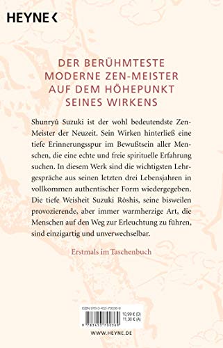 Auch über 30 Jahre nach seinem Tod gilt Shunryu Suzuki als bedeutendster Zen-Meister der Neuzeit. In diesem Werk sind seine wichtigsten Lehrgespräche aus den letzten Lebensjahren in vollkommen authentischer Form wiedergegeben. Die kauzige Weisheit des "Vaters des westlichen Zen", seine verständliche, bisweilen provozierende Art, die Menschen wachzurütteln und auf den Weg zur Erleuchtung zu führen, sind einzigartig und unverwechselbar.