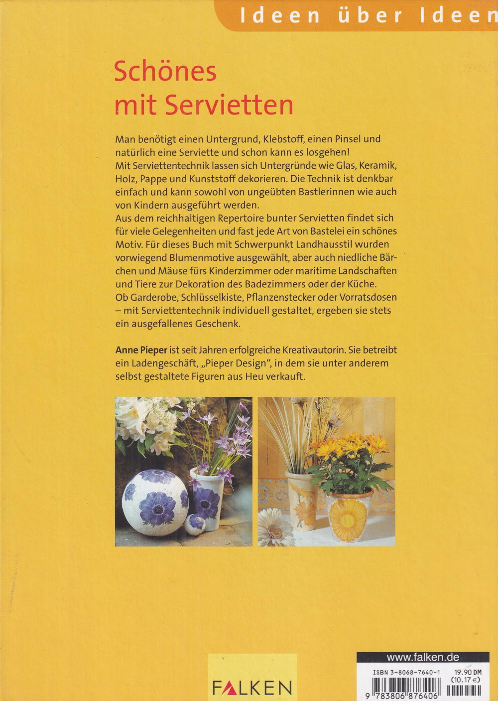 Man benötigt einen Untergrund, Klebstoff, einen Pinsel und natürlich eine Serviette und schon kann es losgehen! Mit Serviettentechnik lassen sich Untergründe wie Glas, Keramik, Holz, Pappe und Kunststoff dekorieren. Die Technik ist denkbar einfach und kann sowohl von ungeübten Bastlerinnen wie auch von Kindern ausgeführt werden. Aus dem reichhaltigen Repertoire bunter Servietten findet sich für viele Gelegenheiten und fast jede Art von Bastelei ein schönes Motiv. Für dieses Buch mit Schwerpunkt Landhausstil wurden vorwiegend Blumenmotive ausgewählt, aber auch niedliche Bärchen und Mäuse fürs Kinderzimmer oder maritime Landschaften und Tiere zur Dekoration des Badezimmers oder der Küche. Ob Garderobe, Schlüsselkiste, Pflanzenstecker oder Vorratsdosen - mit Serviettentechnik individuell gestaltet, ergeben sie stets ein ausgefallenes Geschenk.